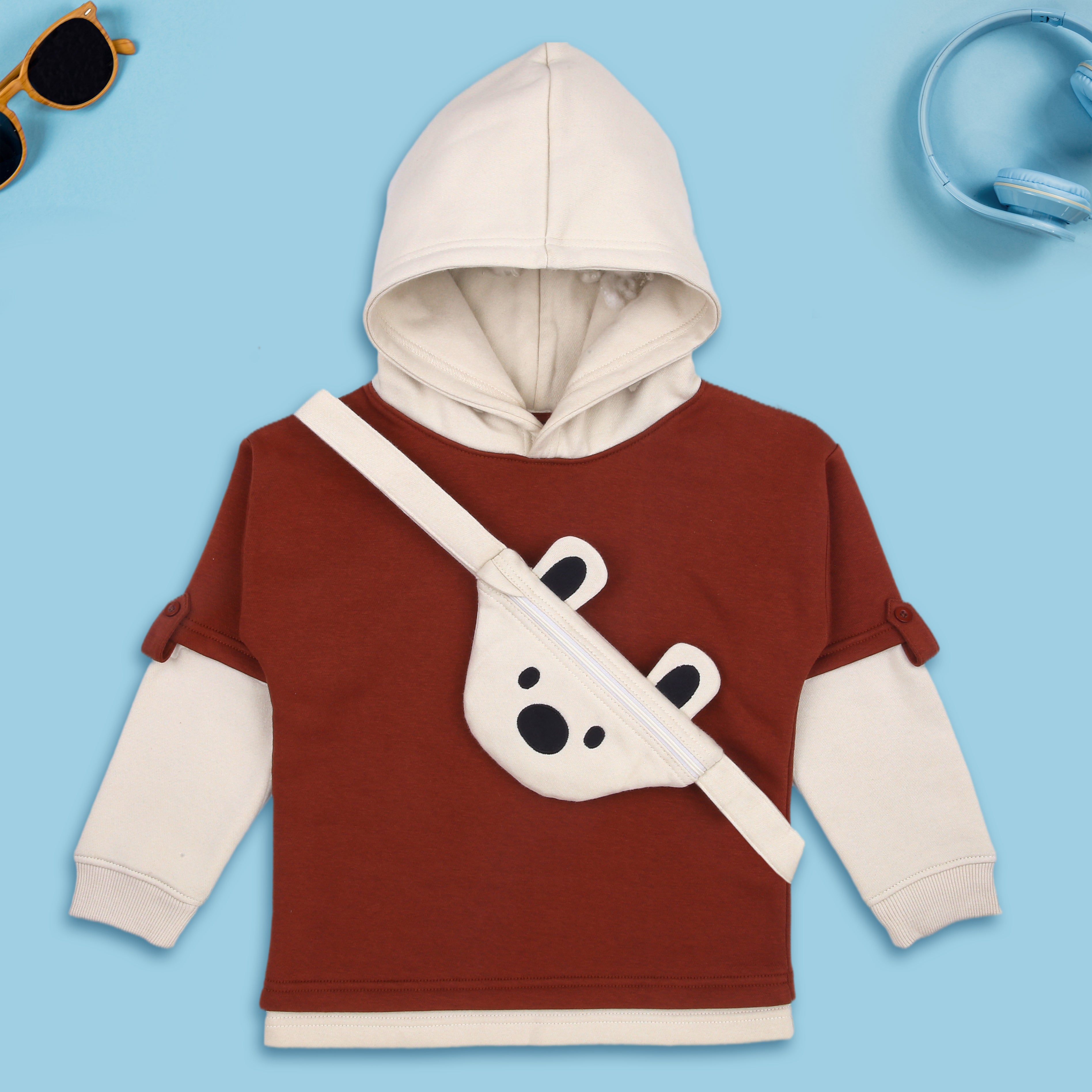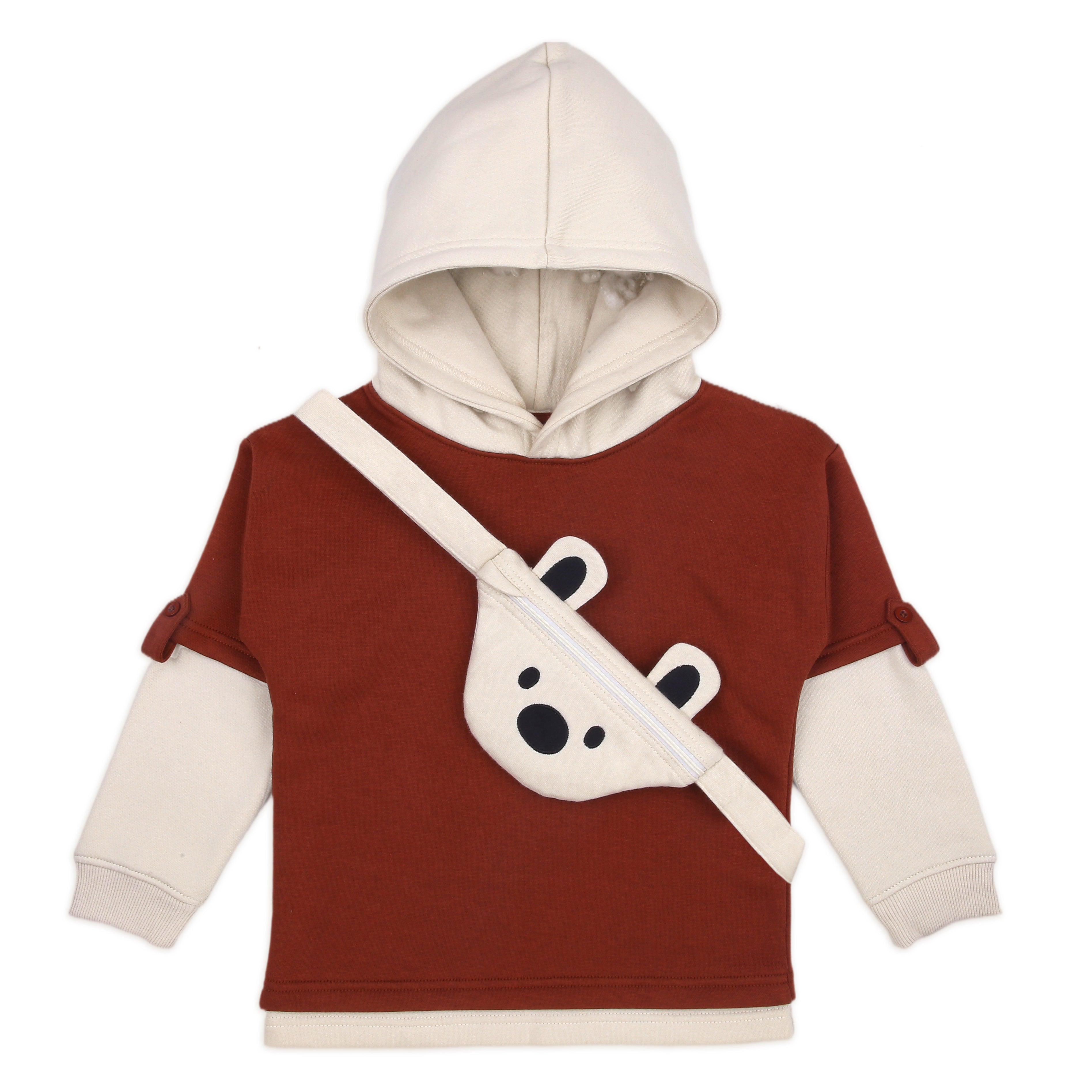 Let your little explorer take on chilly days in the most adorable way! This 2-piece hoodie is thoughtfully designed for toddlers aged 2 to 5 years and features a soft fleece inner layer for unmatched coziness. The playful bear face sling bag is not just a stylish touch – it's fully removable and functional, perfect for tiny treasures. The double-layered look with roll-up sleeves gives it a trendy, layered outfit vibe without compromising comfort.