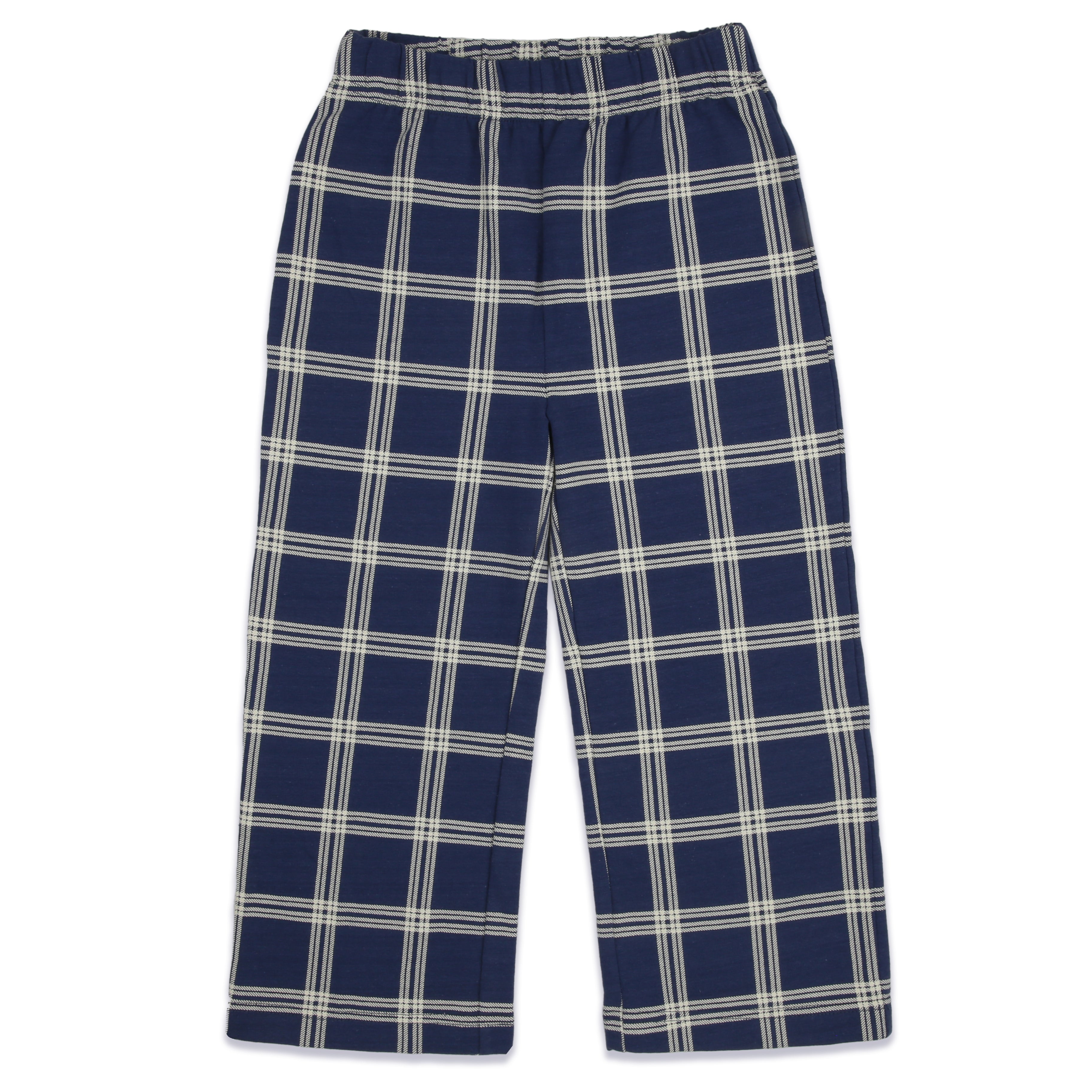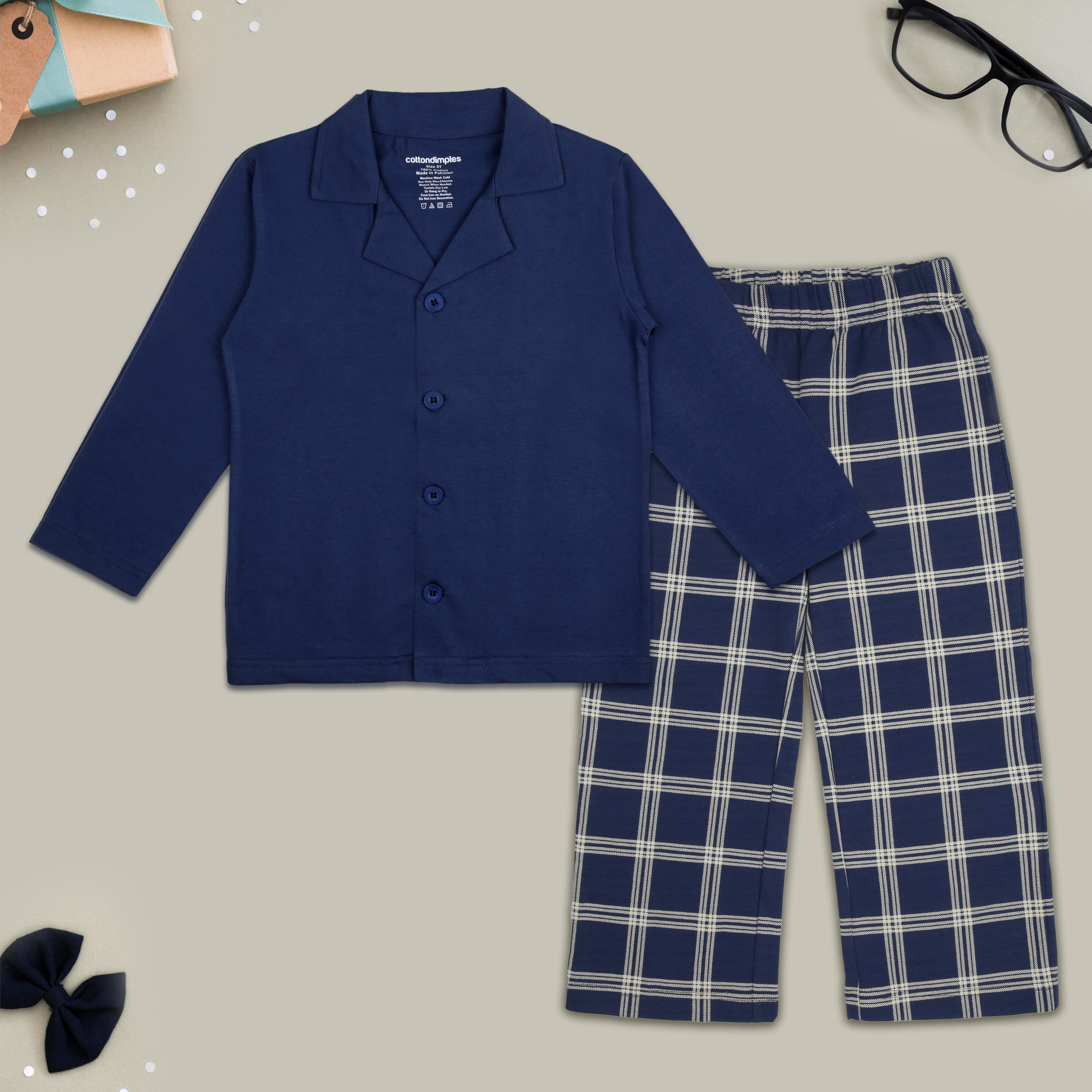 Let your little gentleman drift off in style and comfort with our timeless winter PJ set. The top features a soft, navy blue, full-sleeved button-down shirt with a smart notch collar that adds a touch of charm to bedtime. Paired with coordinated yarn-dyed checkered bottoms, this set offers warmth and breathability for chilly nights. The elastic waistband ensures a comfy fit for active toddlers.