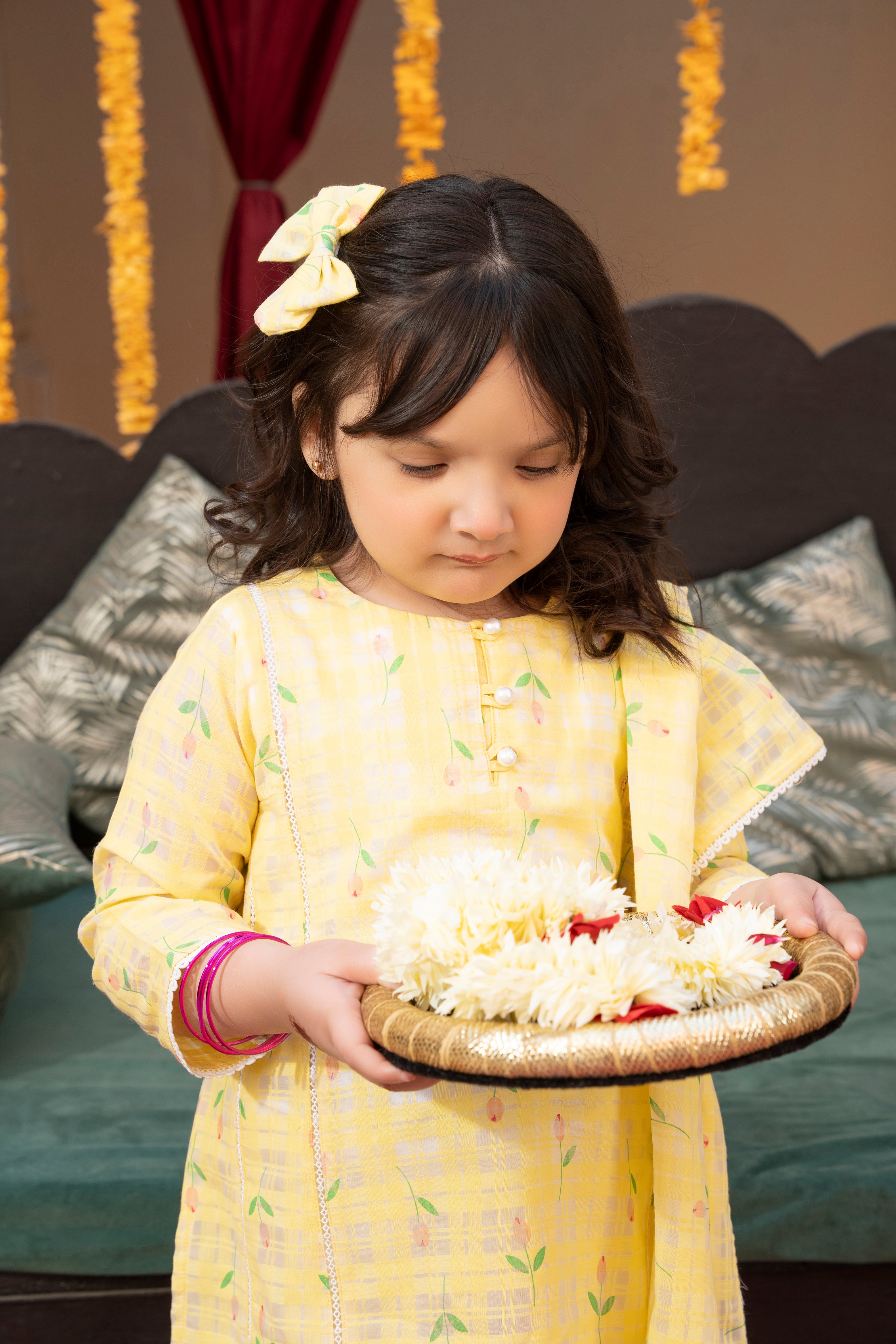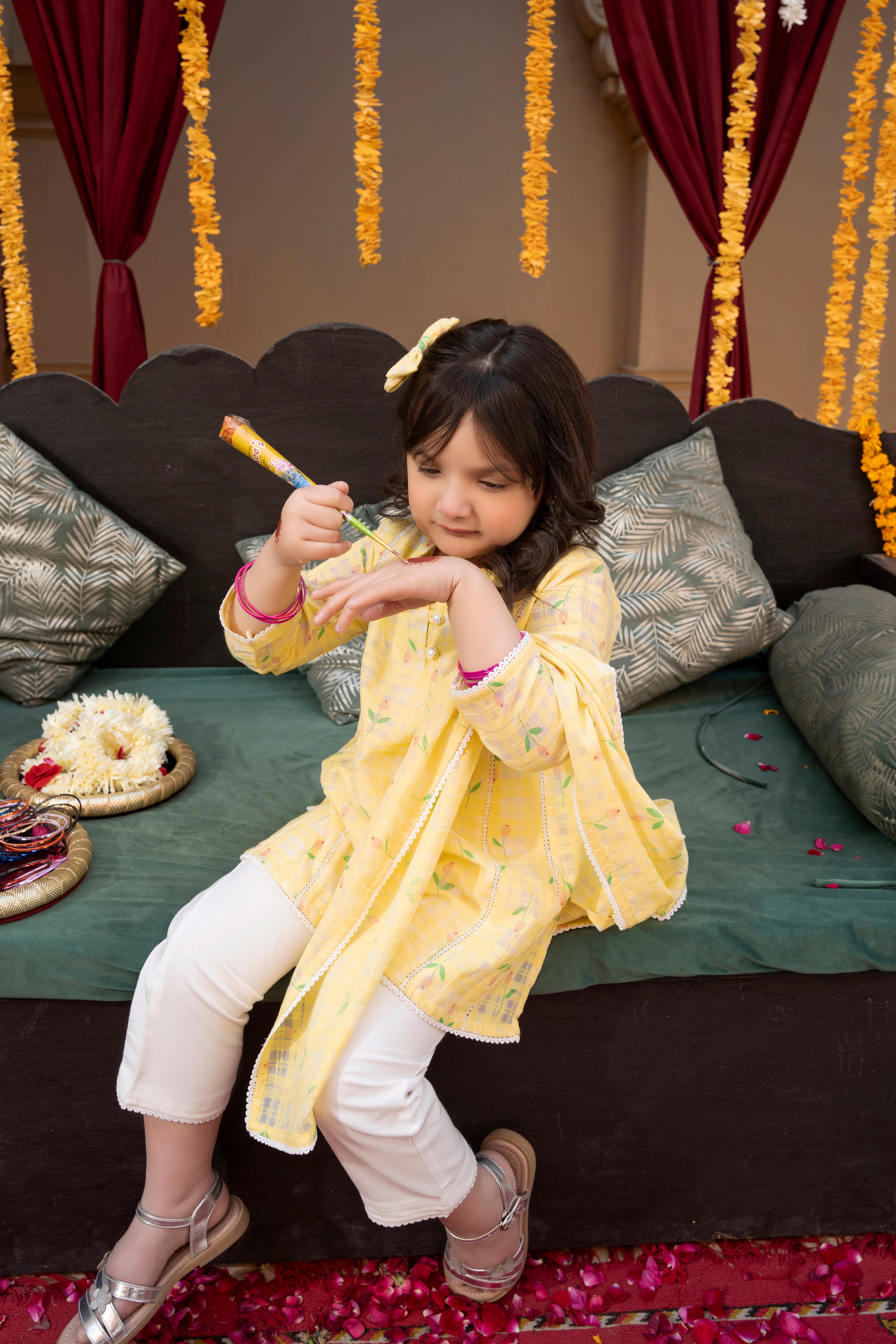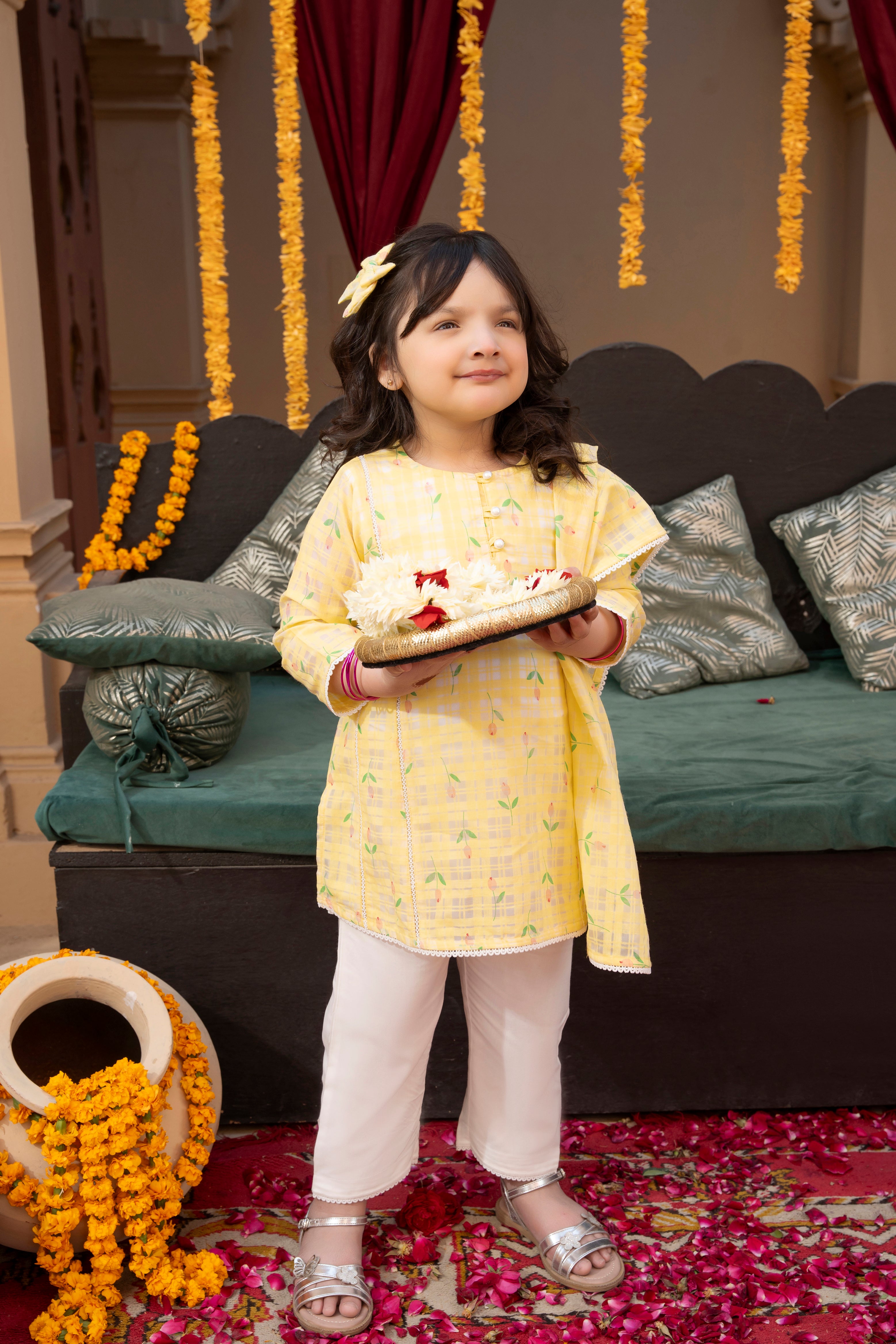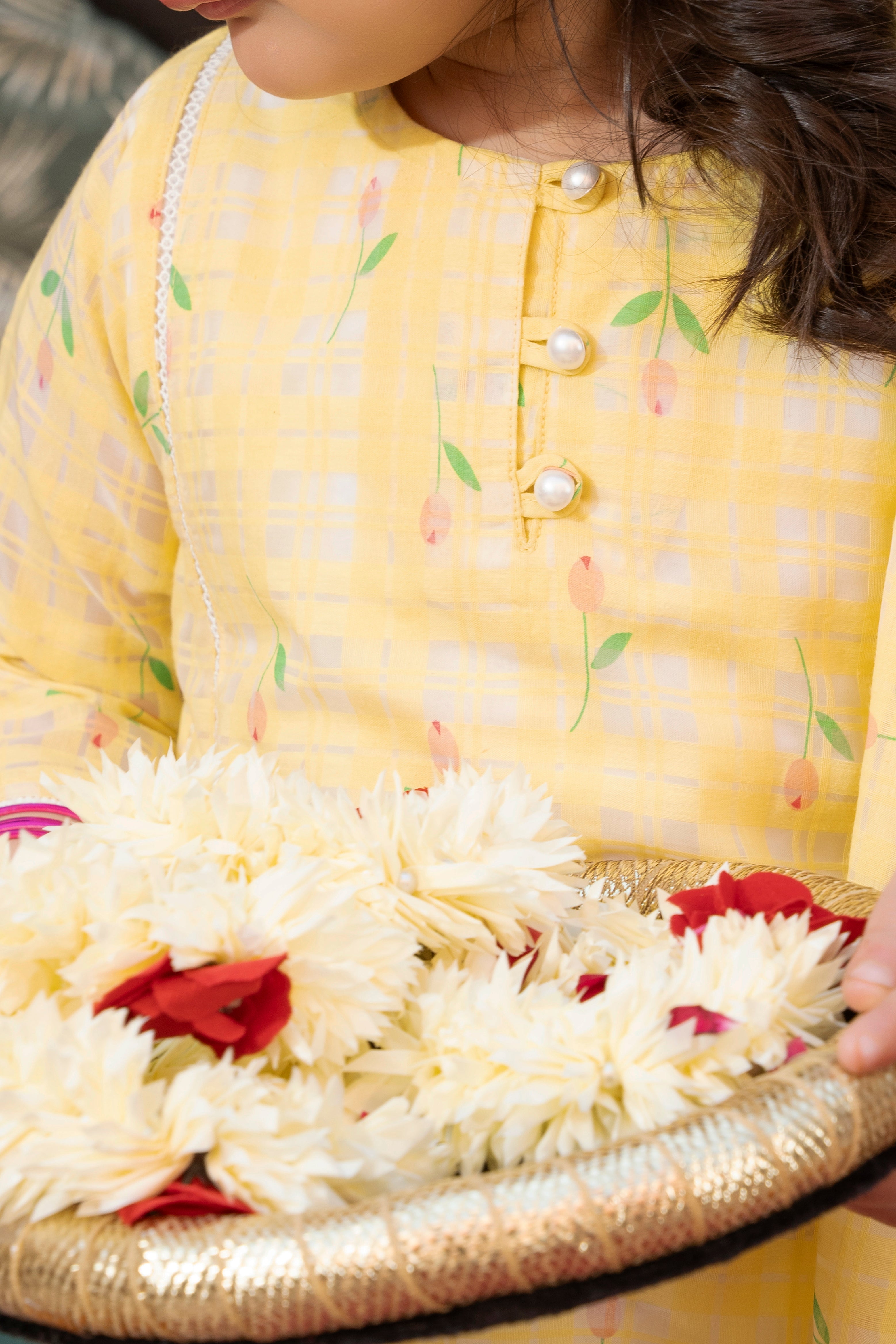 Add a pop of color and elegance to your wardrobe with this stunning lemon-yellow lawn printed outfit. Featuring delicate panels joined with a contrasting join lace, this outfit exudes sophistication and charm. The neckline is adorned with pearl buttons, adding a subtle touch of luxury.
