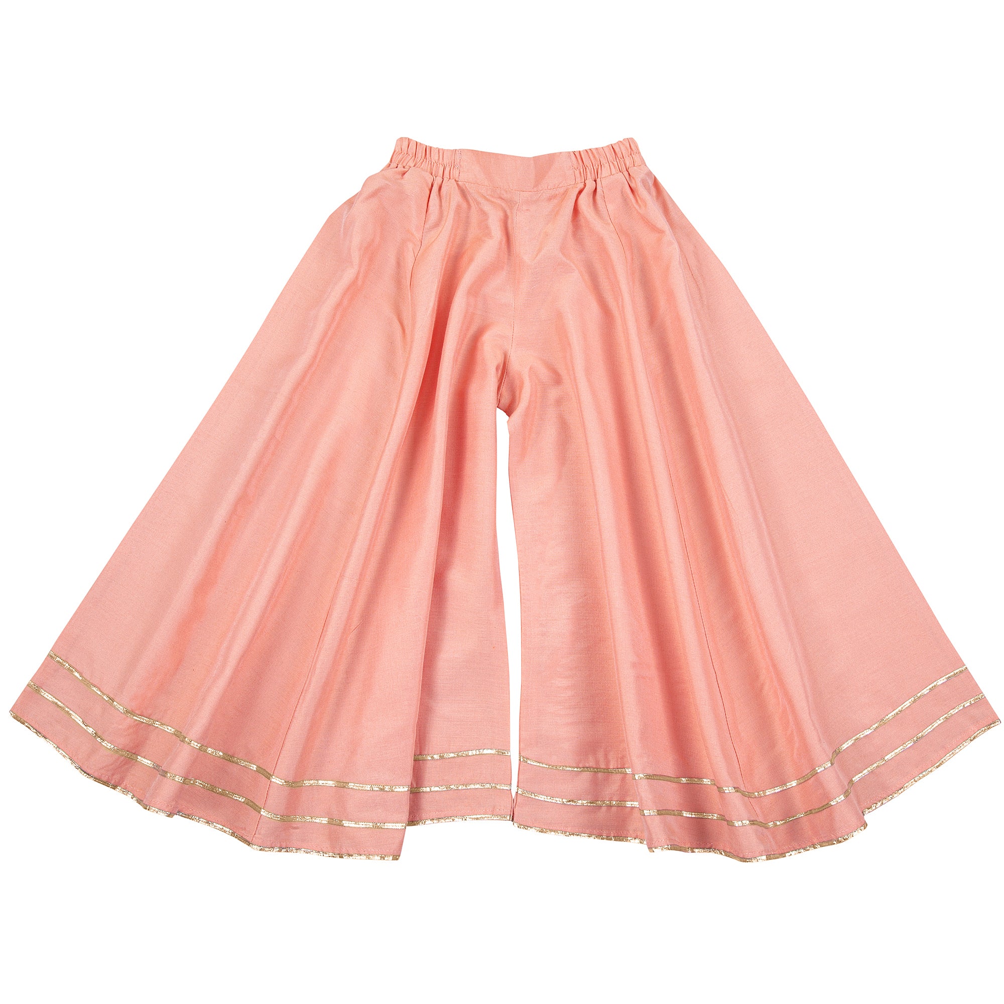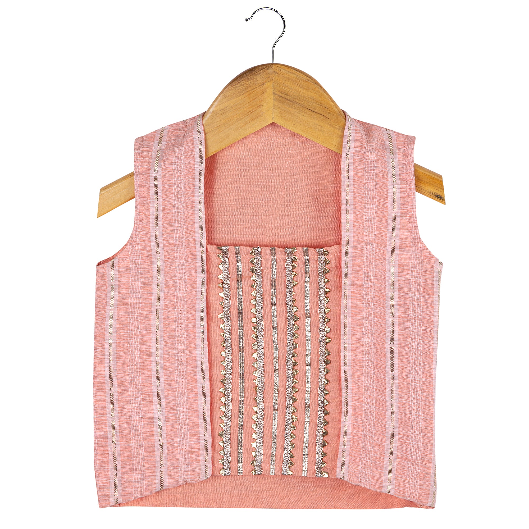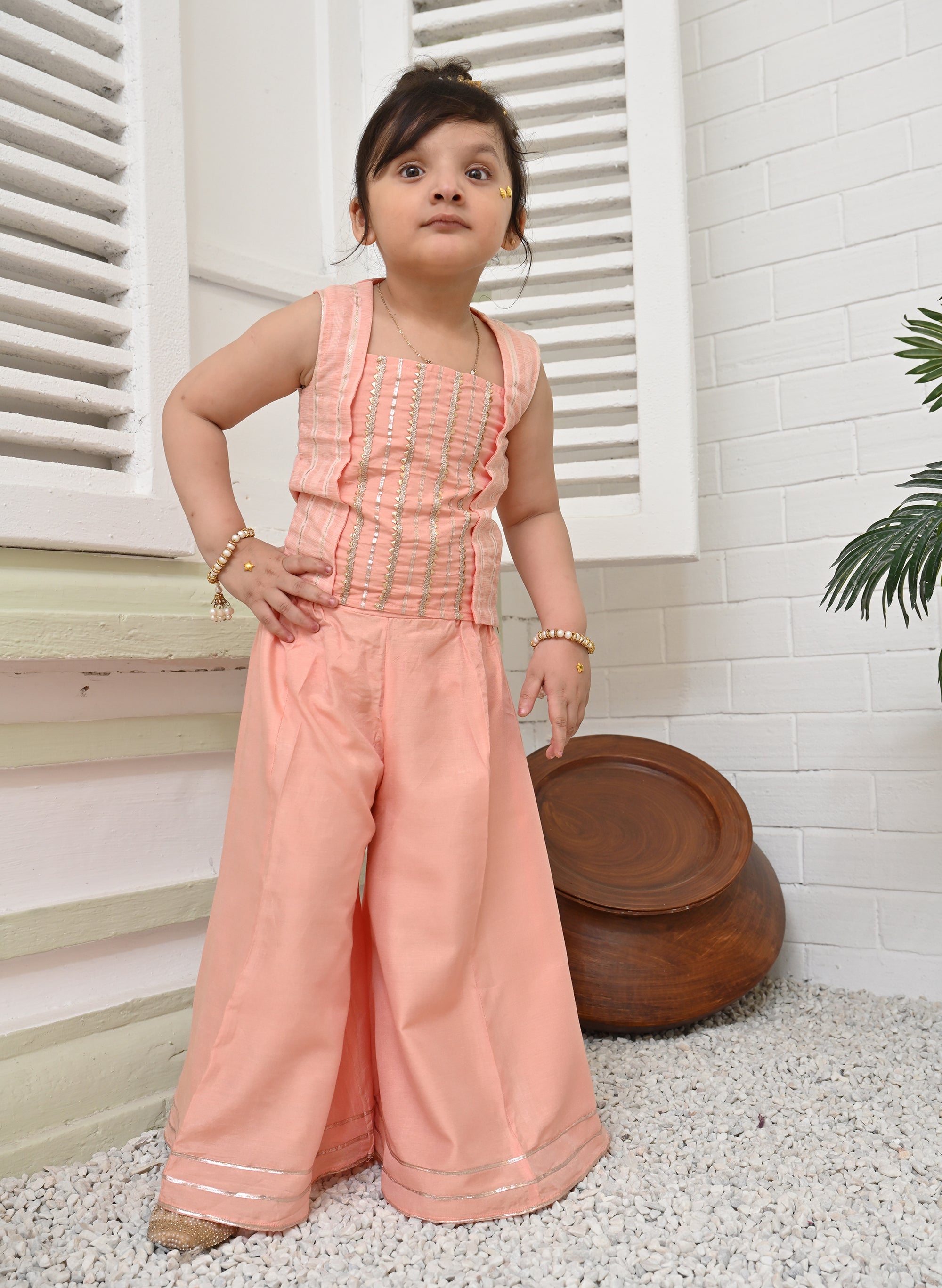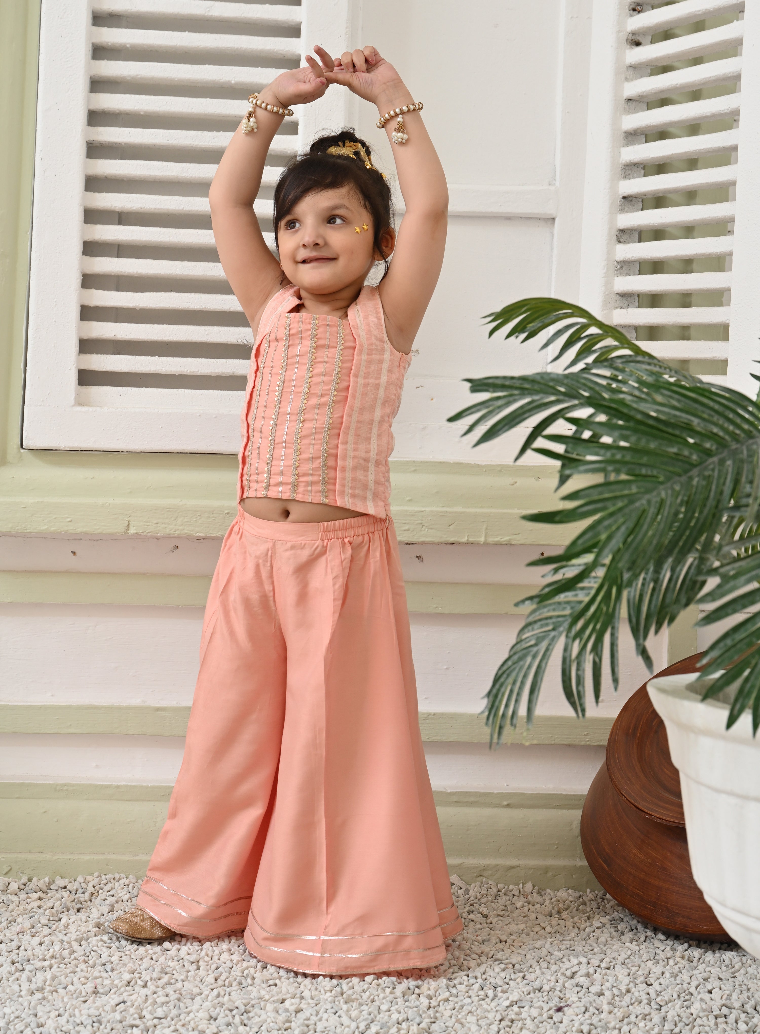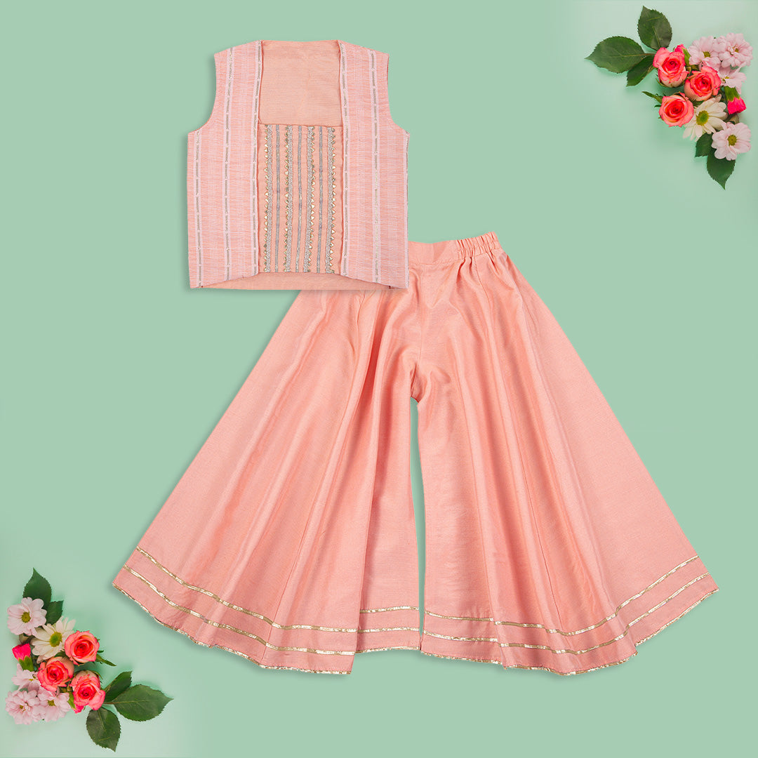 Introducing the Peachy 2-Piece Outfit, perfect for your little one! This outfit features a jacket inspired top with gotta kinari laces, adding a touch of traditional elegance. The box pleated plazzo has a front belt and elasticated waistband for comfort, with a zip attached for easy wear. Embrace trendy and traditional with this must-have outfit.