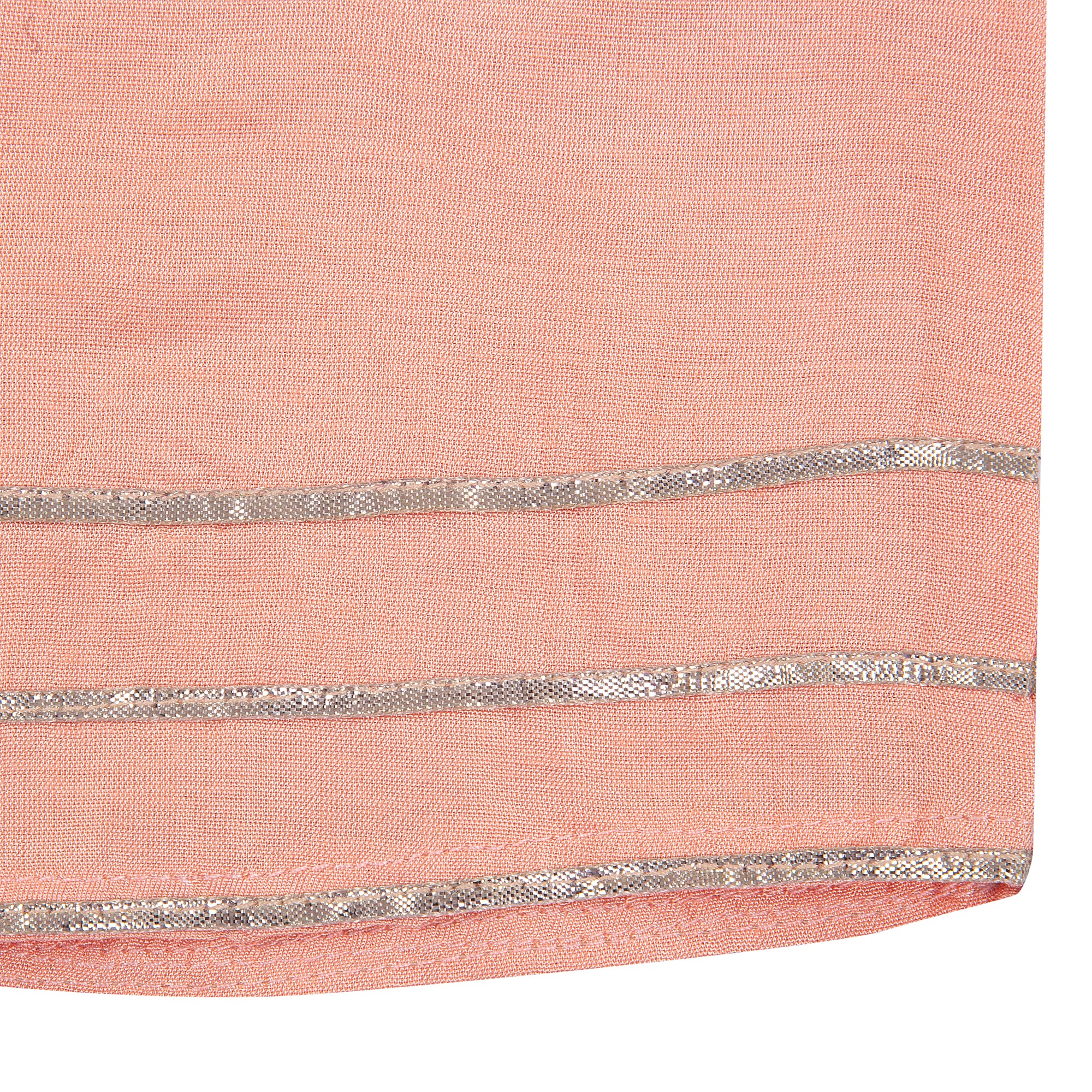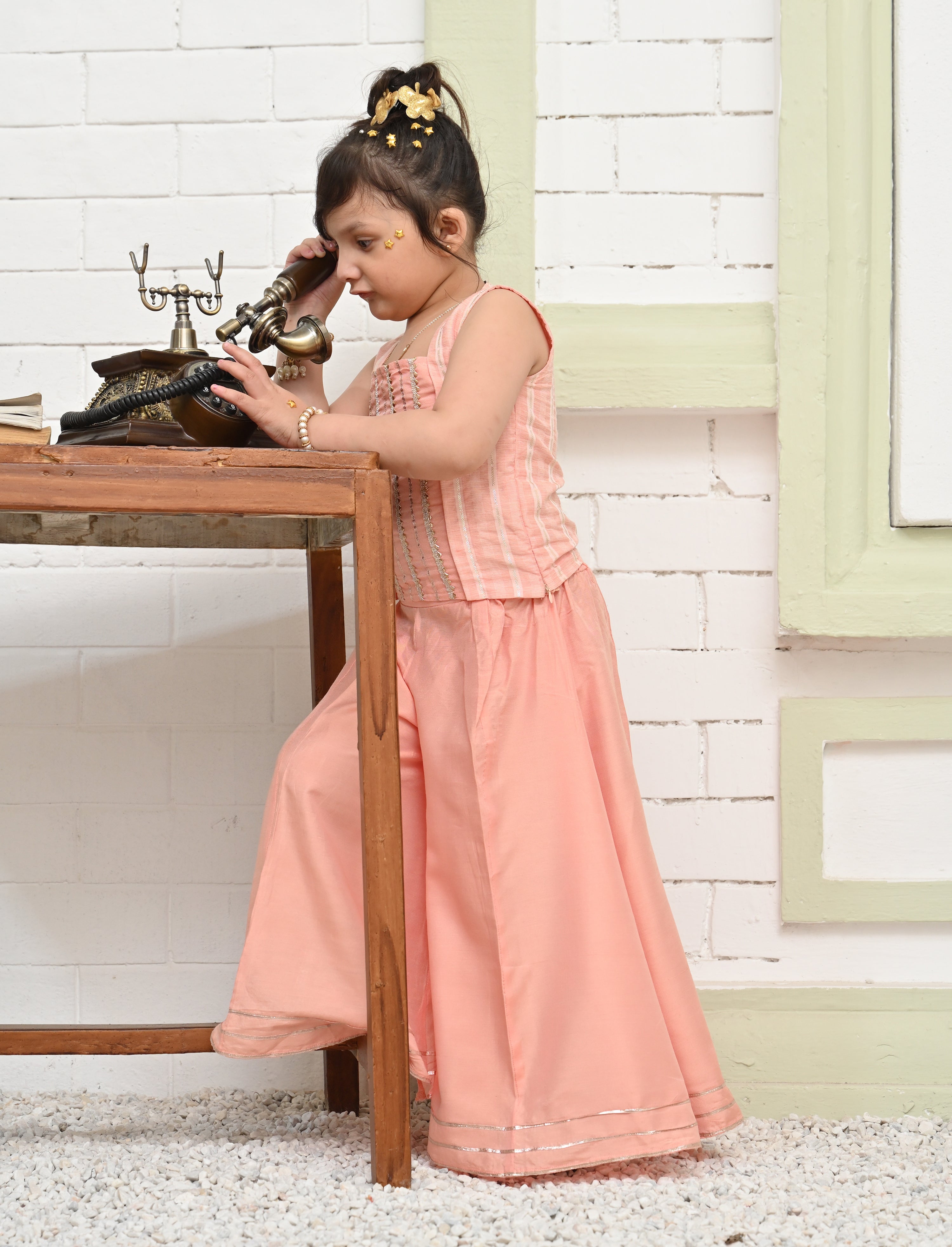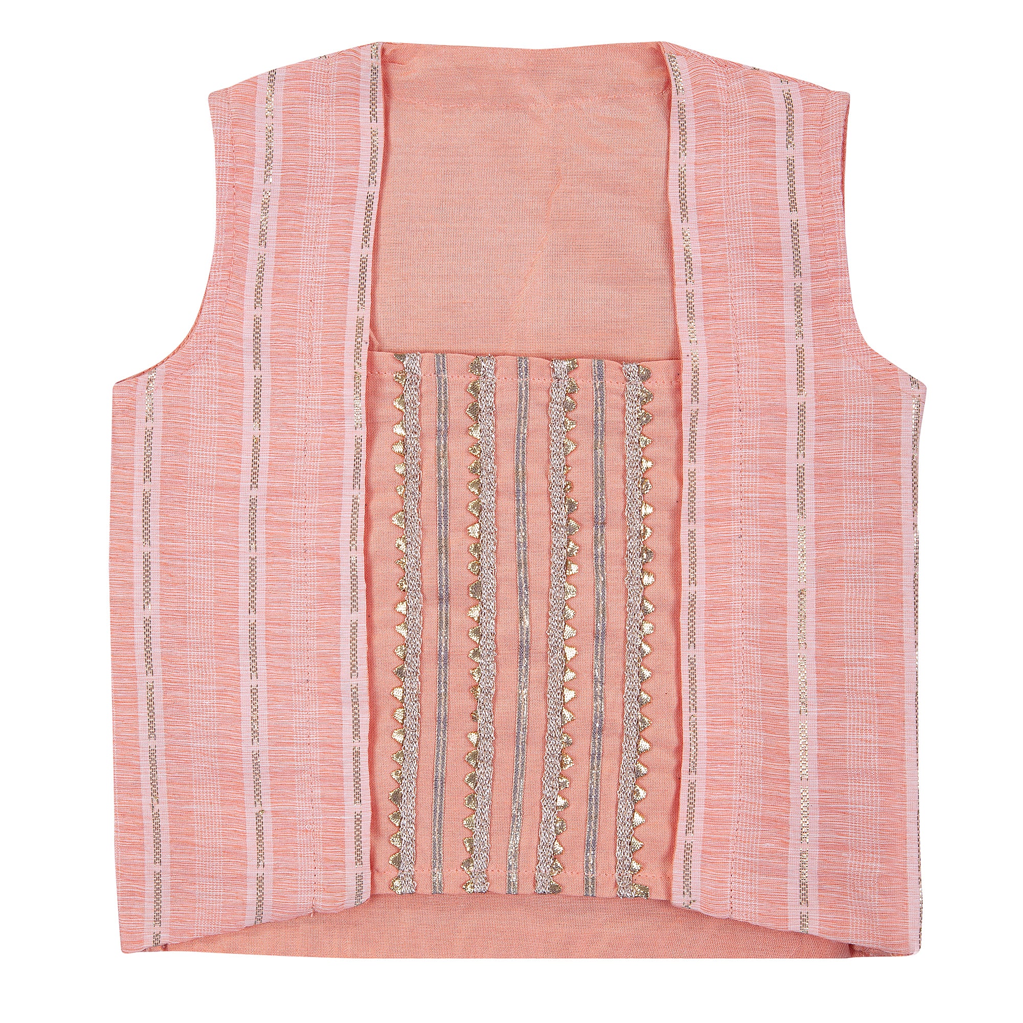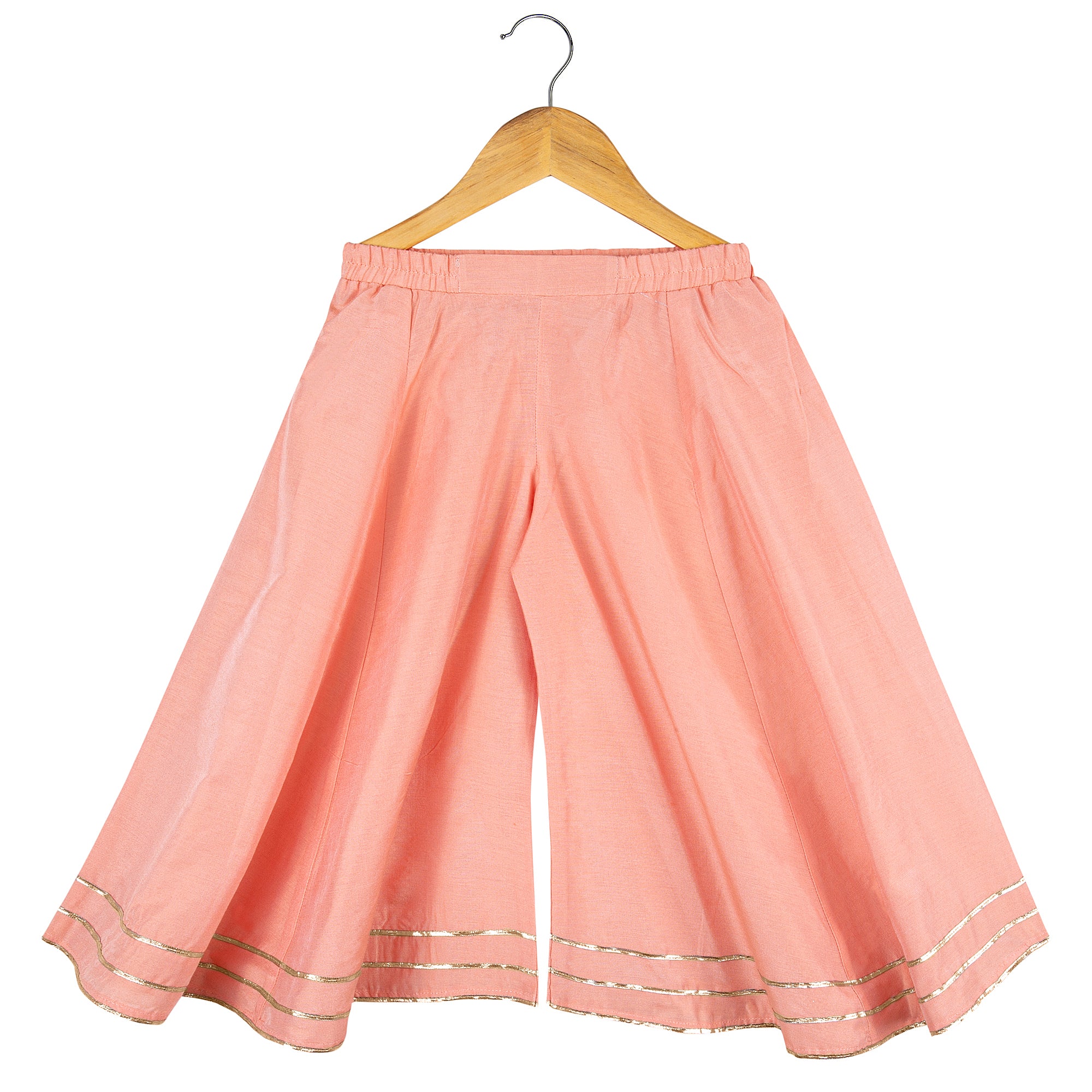 Introducing the Peachy 2-Piece Outfit, perfect for your little one! This outfit features a jacket inspired top with gotta kinari laces, adding a touch of traditional elegance. The box pleated plazzo has a front belt and elasticated waistband for comfort, with a zip attached for easy wear. Embrace trendy and traditional with this must-have outfit.