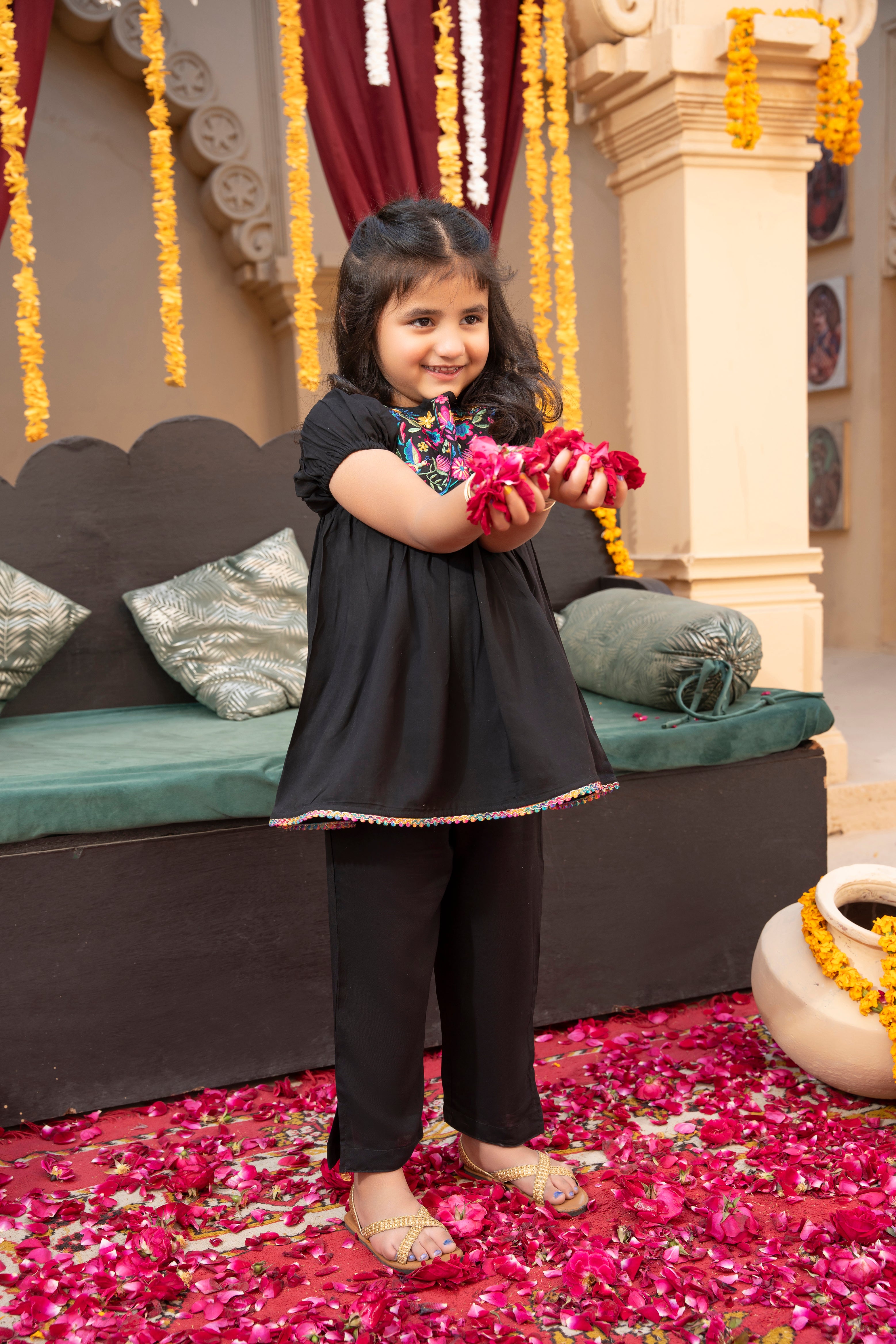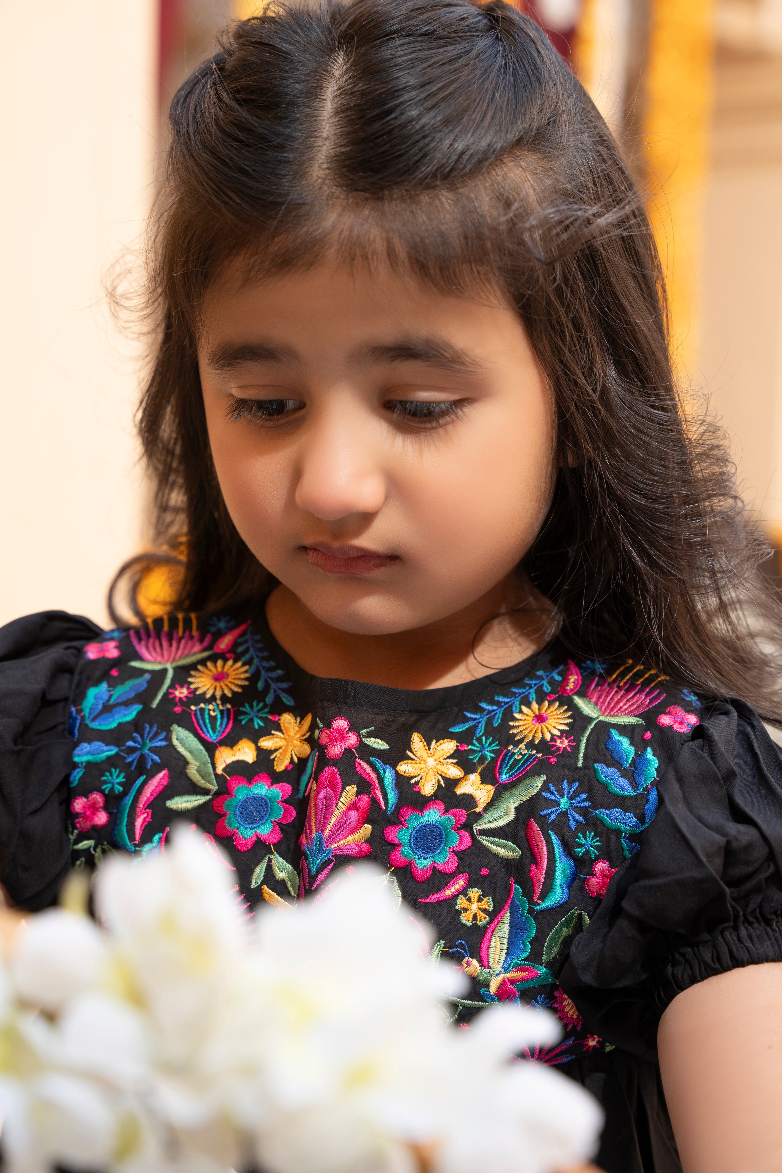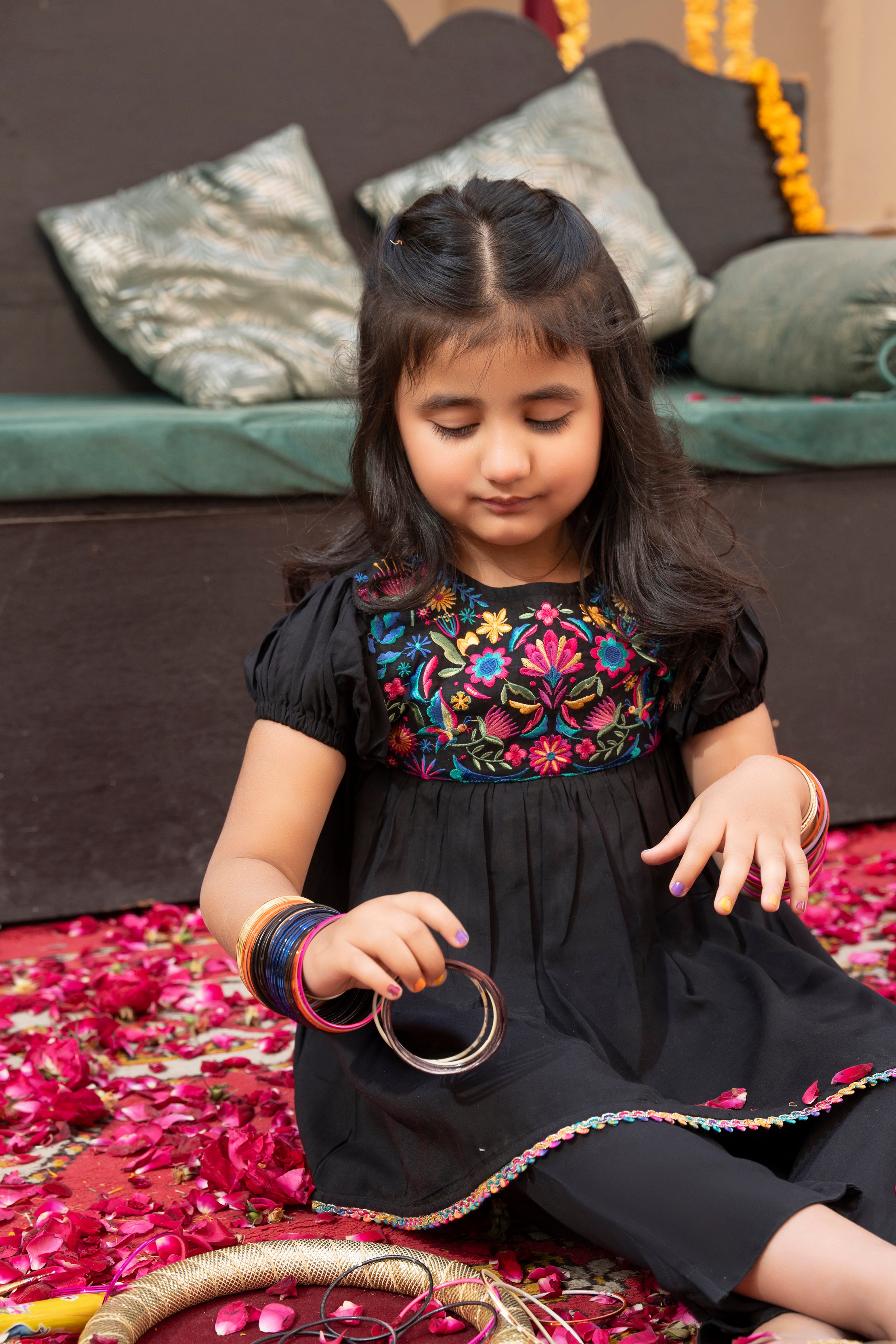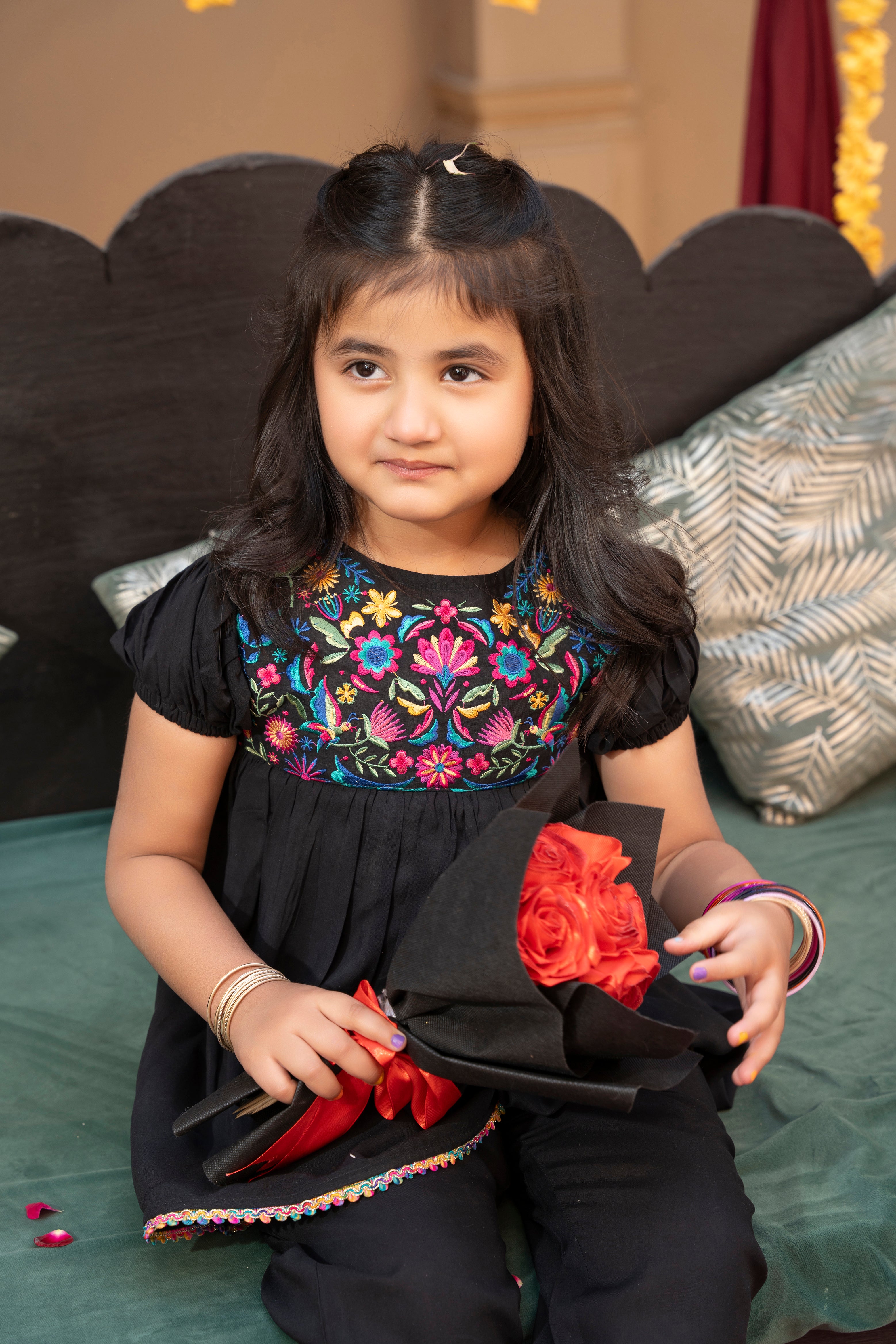 - Black color that complements the vibrant embroidery beautifully