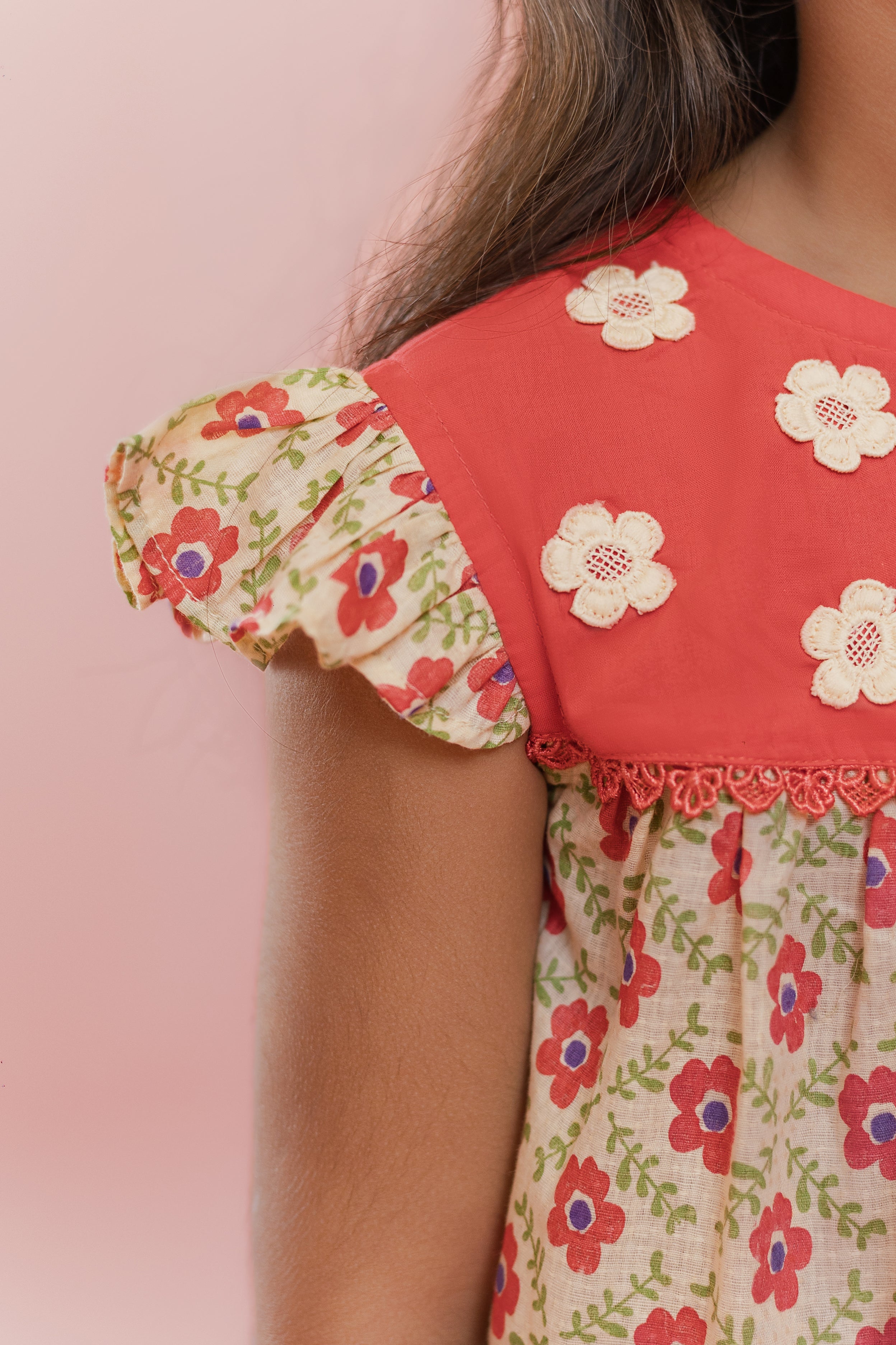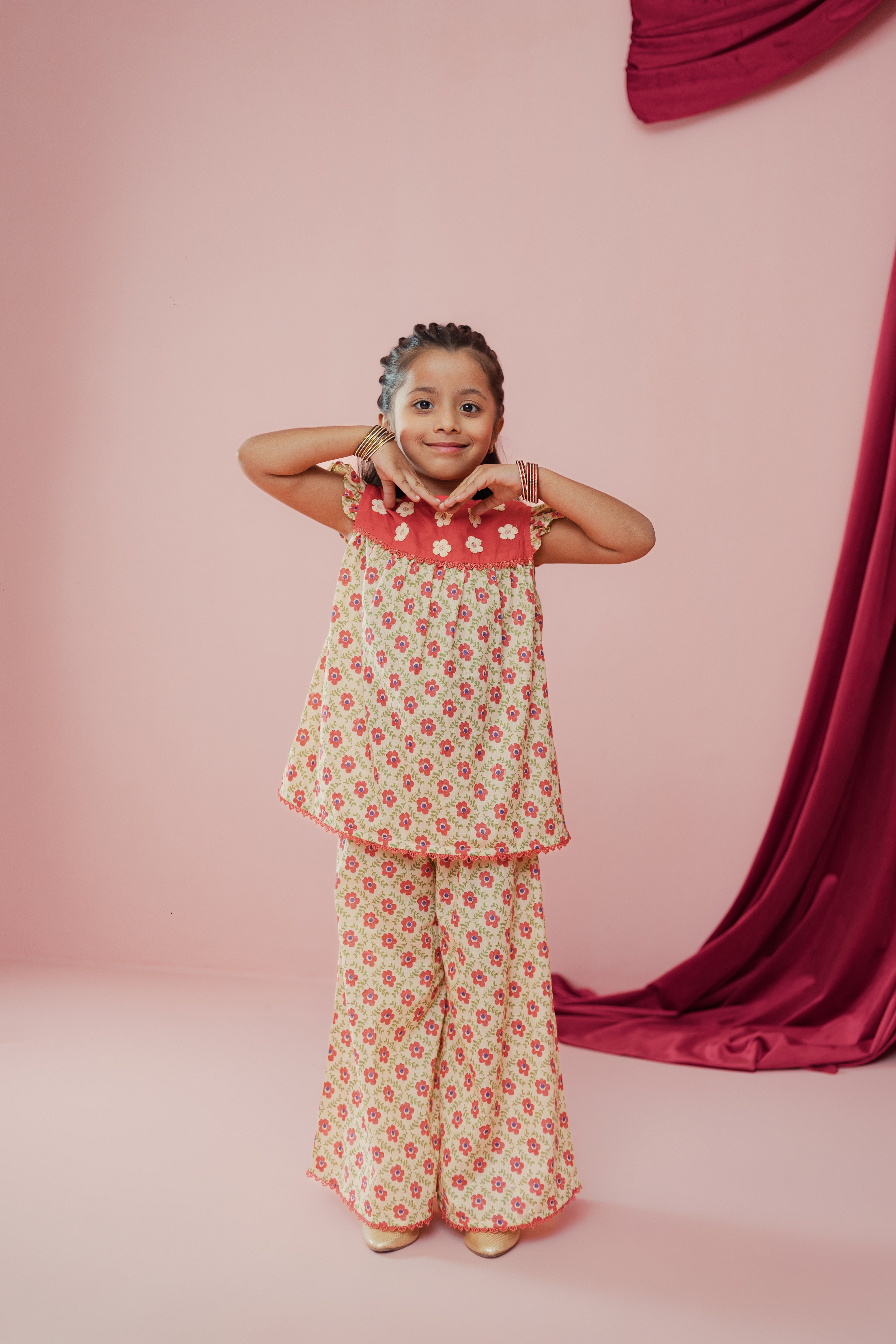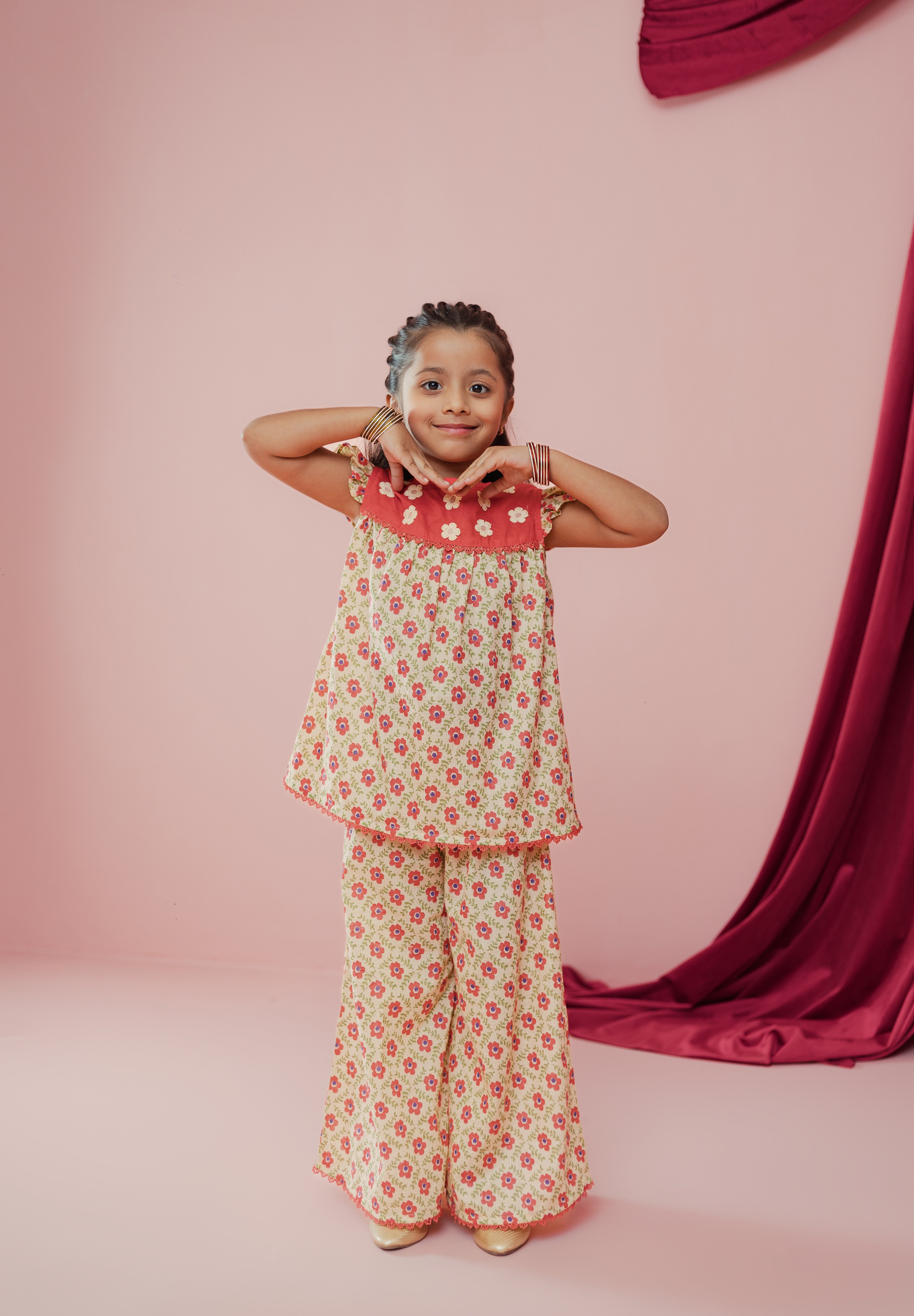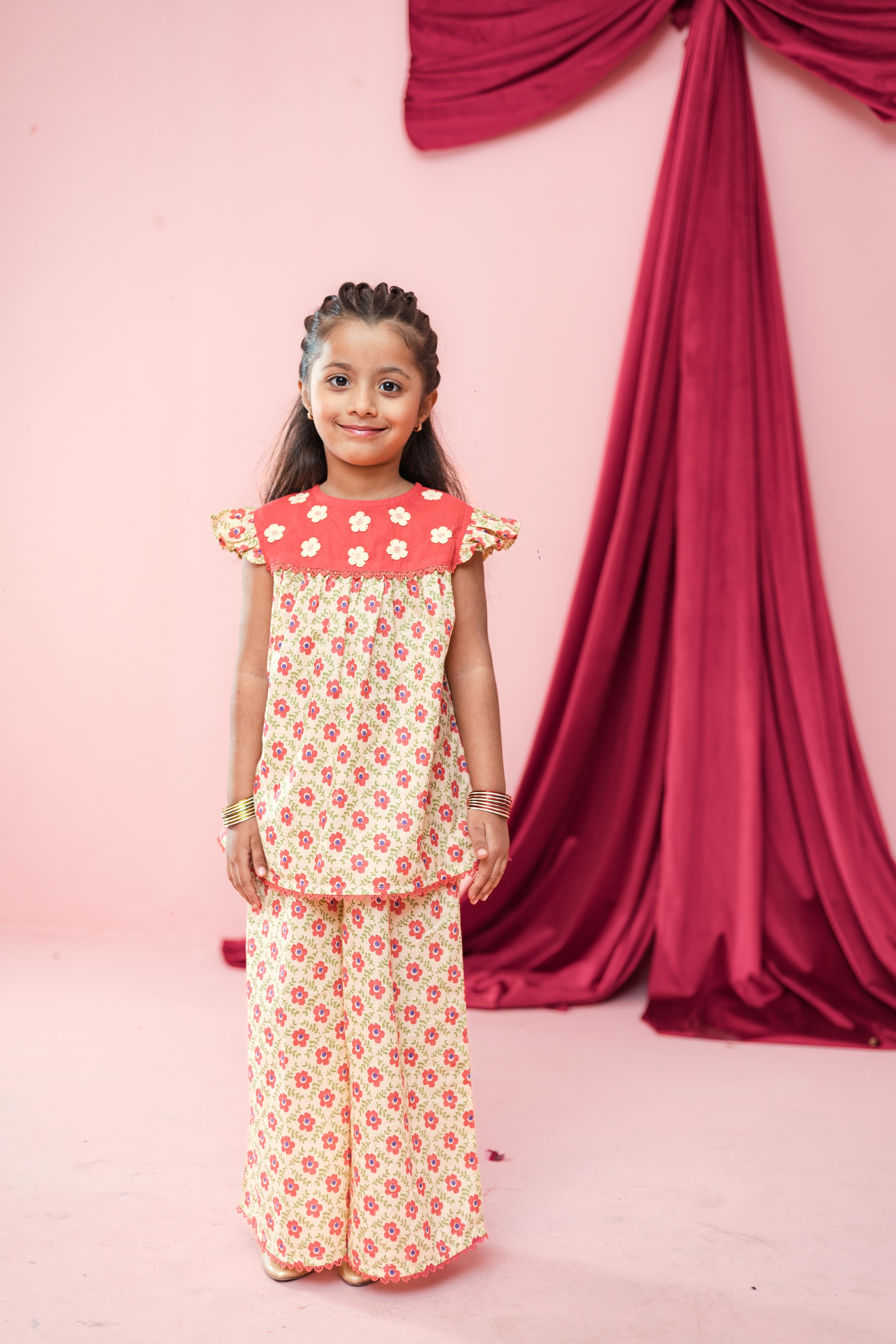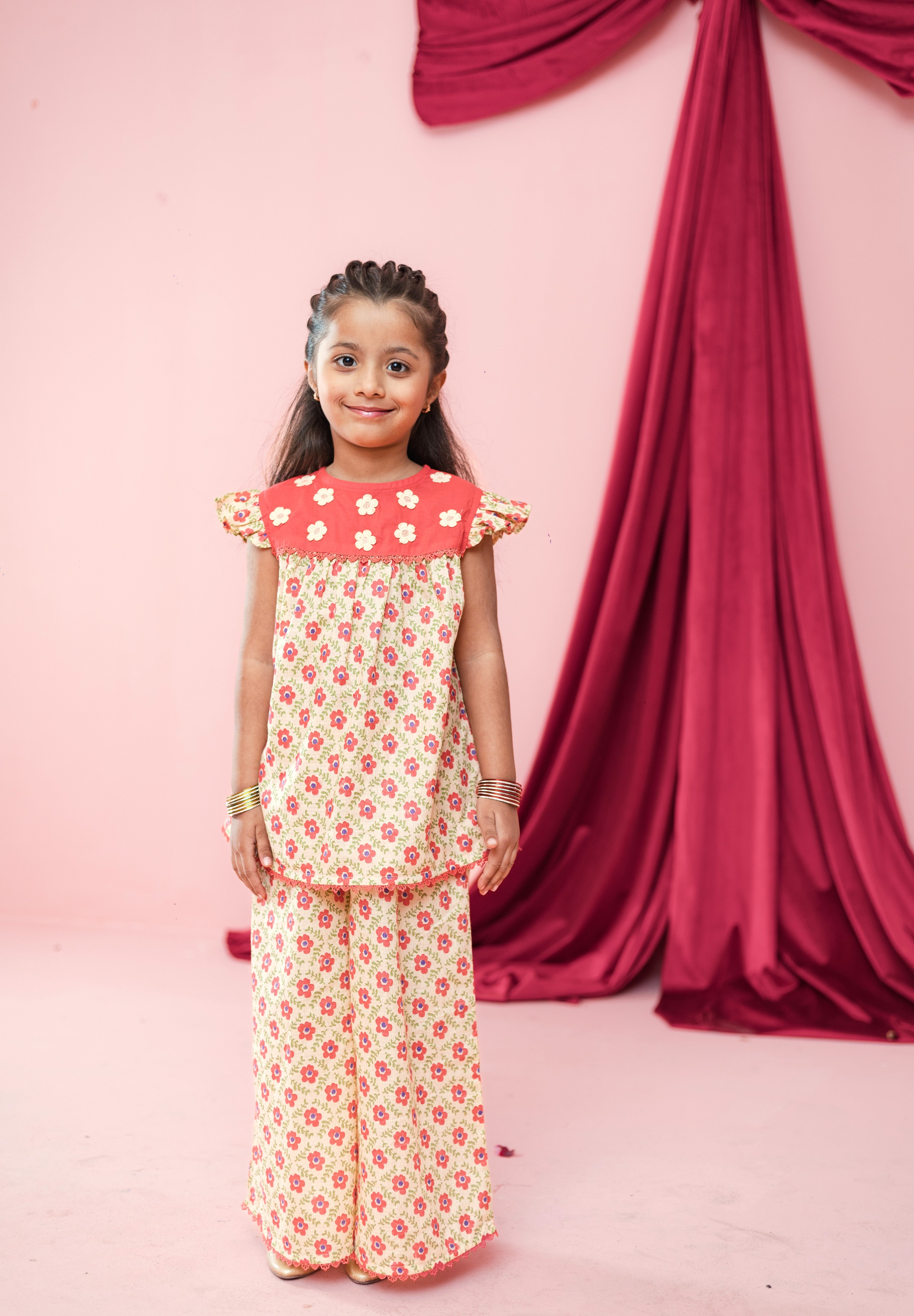 Bright, cheerful, and full of twirl — this adorable floral co-ord set is made for little girls who love to shine at every celebration.