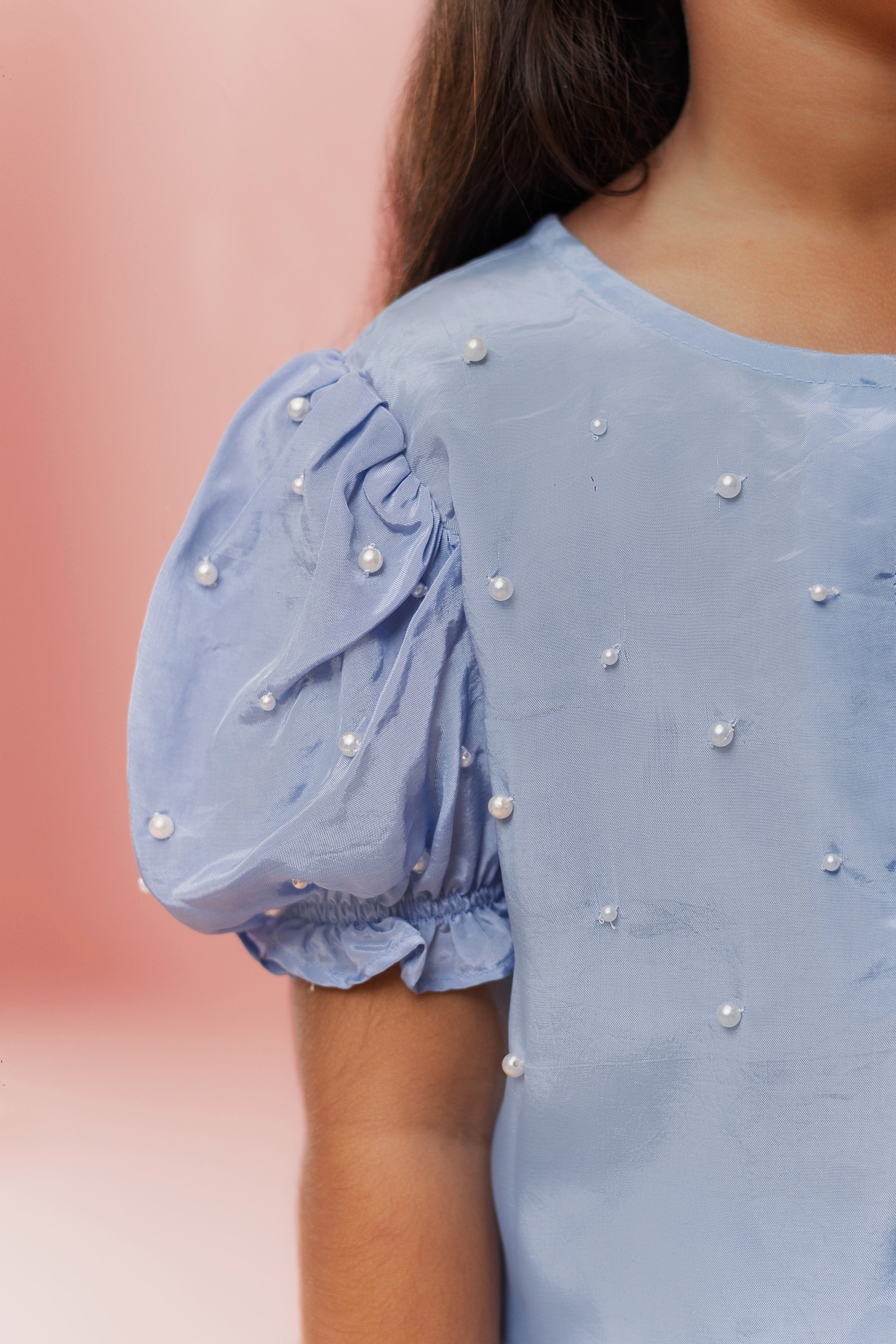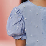 Crafted in premium silk fabric, this 2-piece set features delicate hand-embroidered pearl detailing scattered across the shirt, adding a refined and graceful touch. The puffed sleeves enhance the silhouette, creating a charming and playful look while maintaining comfort.