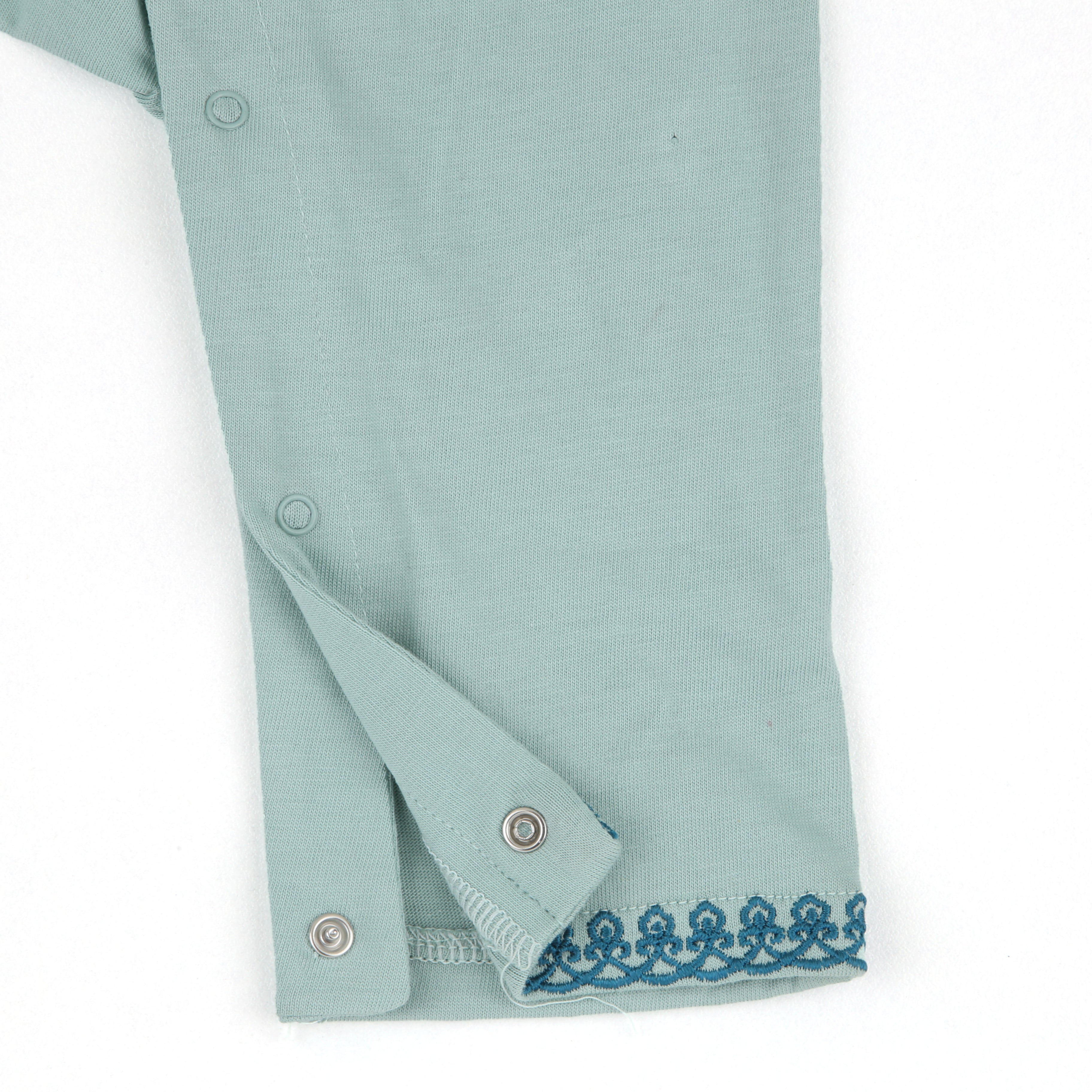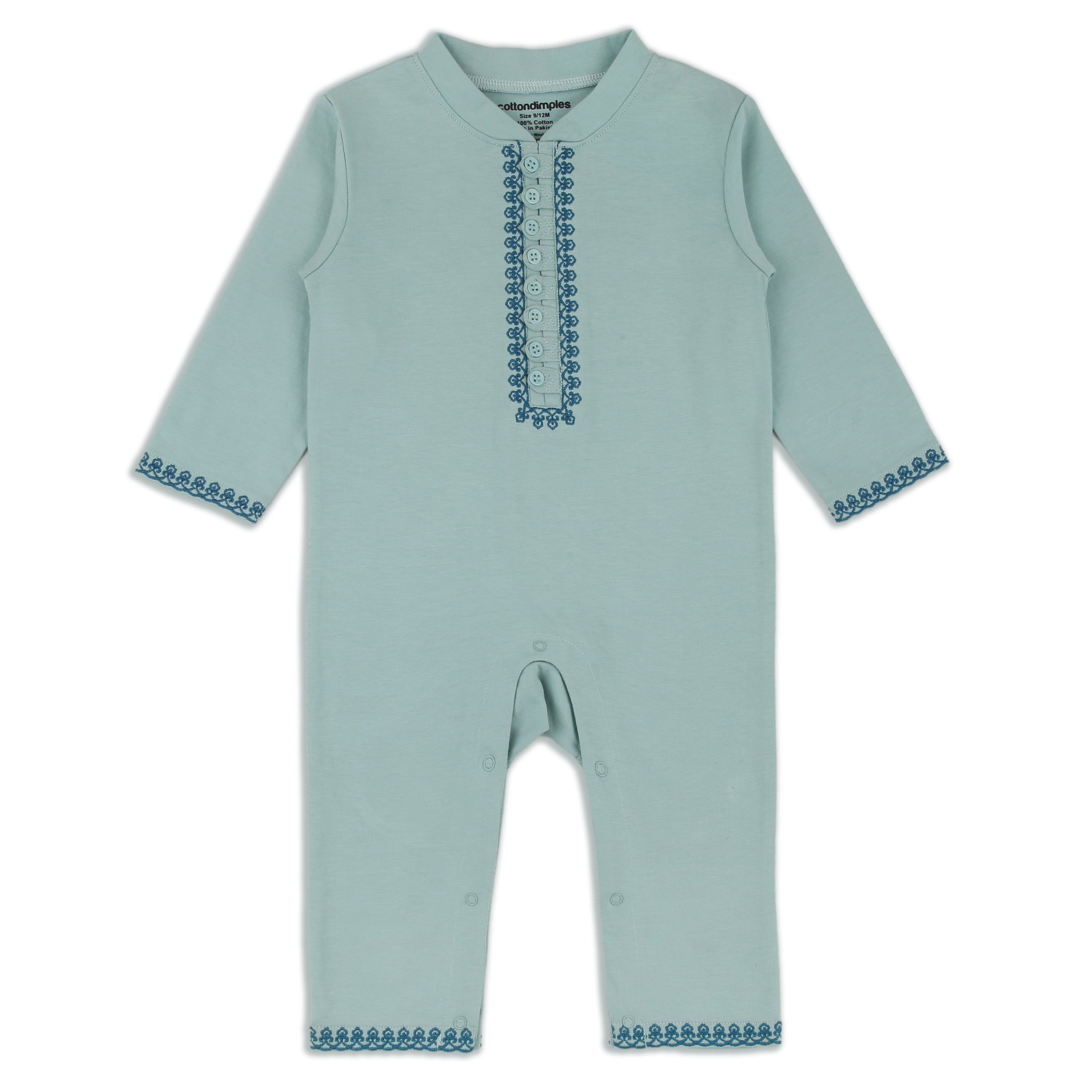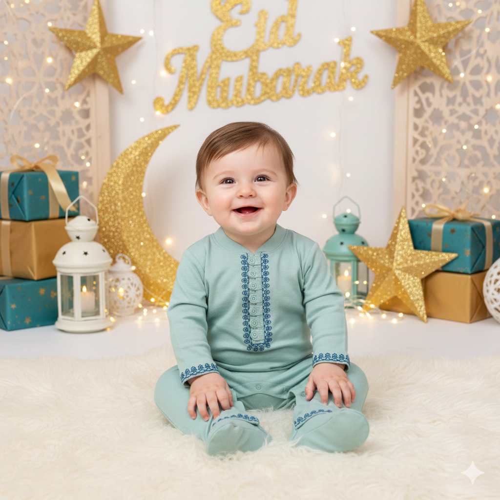 Keep things soft yet festive with the Akbar - Kurta Romper, featuring a refreshing mint green shade with rich navy thread embroidery on the neckline, cuffs, and hem. Designed for comfort and movement, this romper ensures your little one is dressed for Eid without compromising on coziness.
