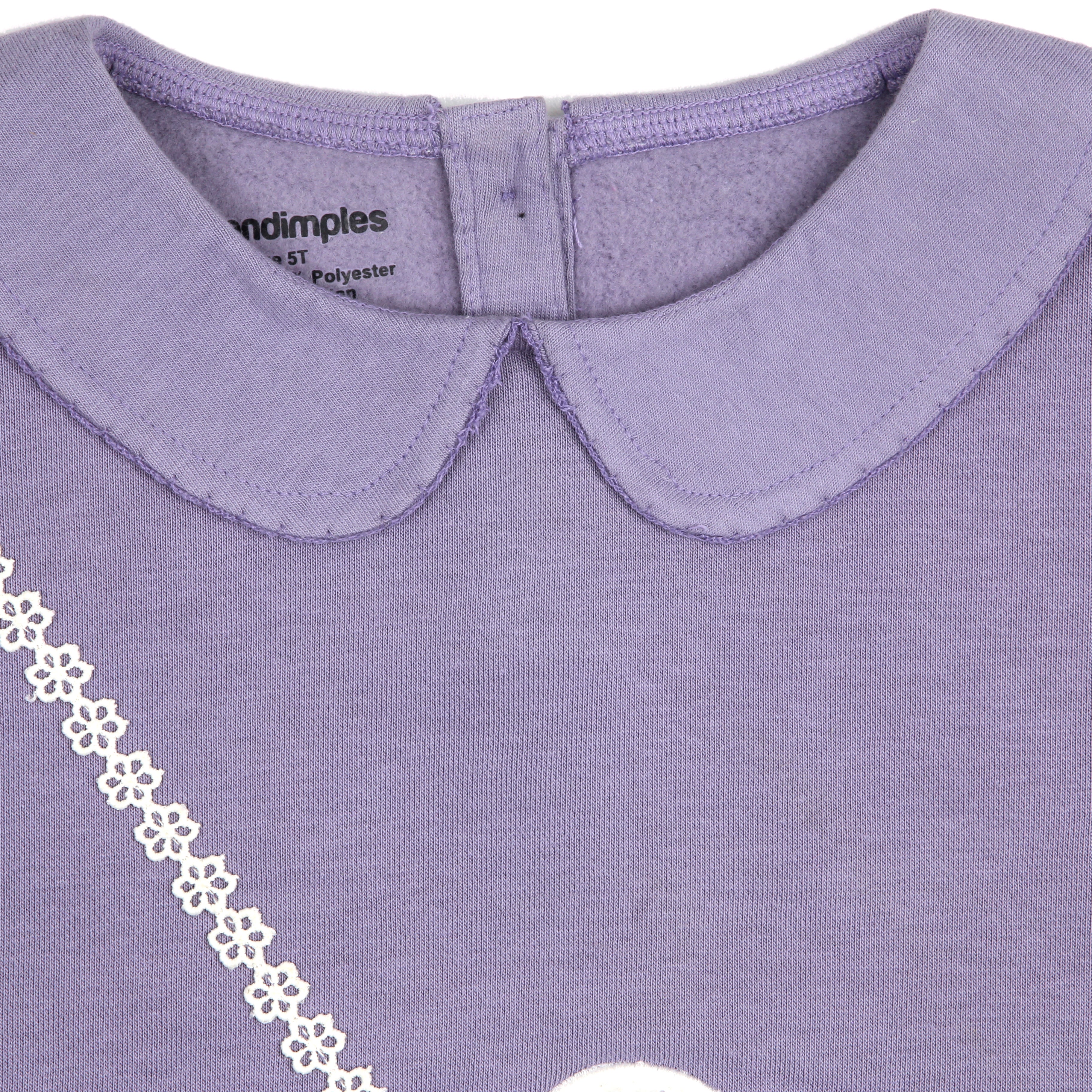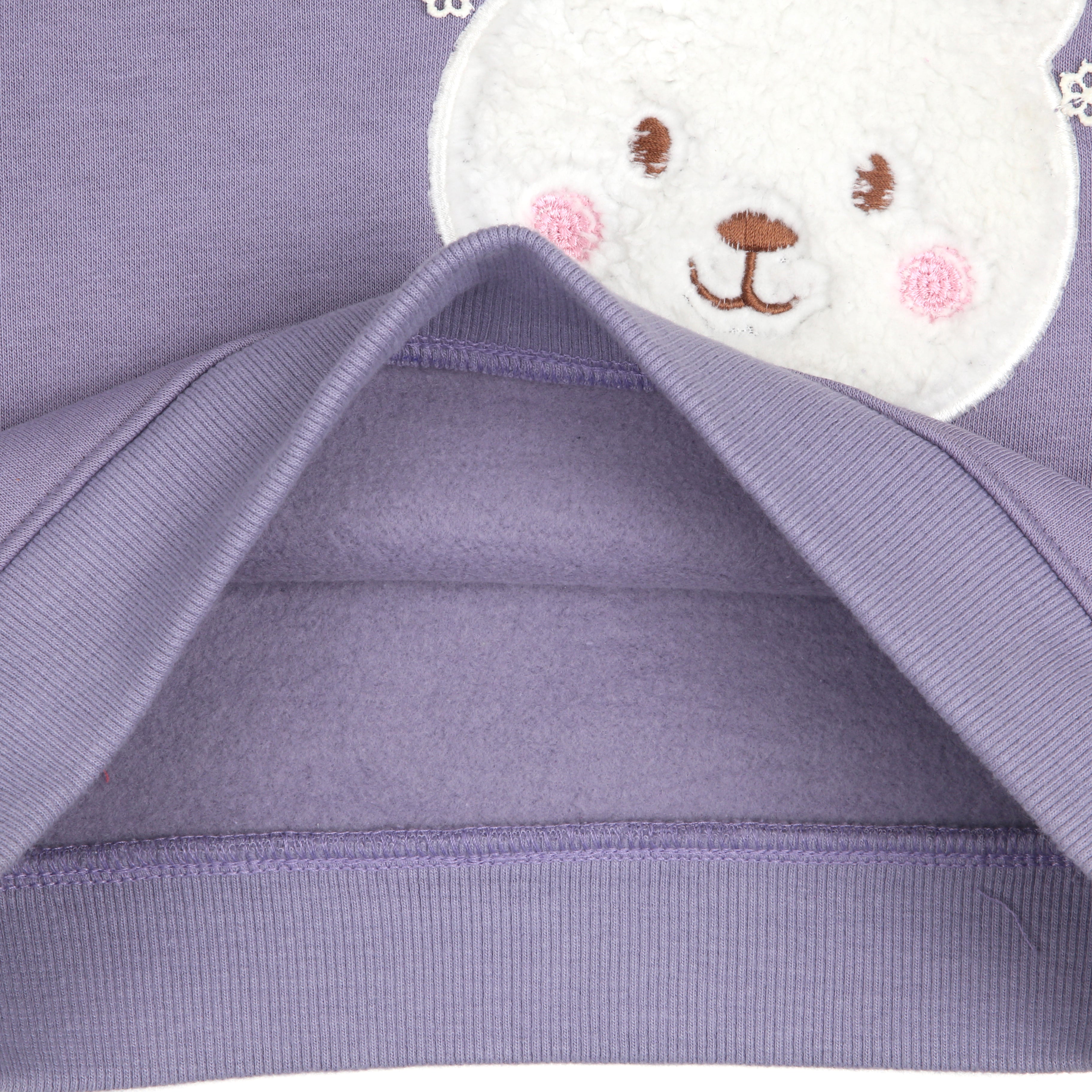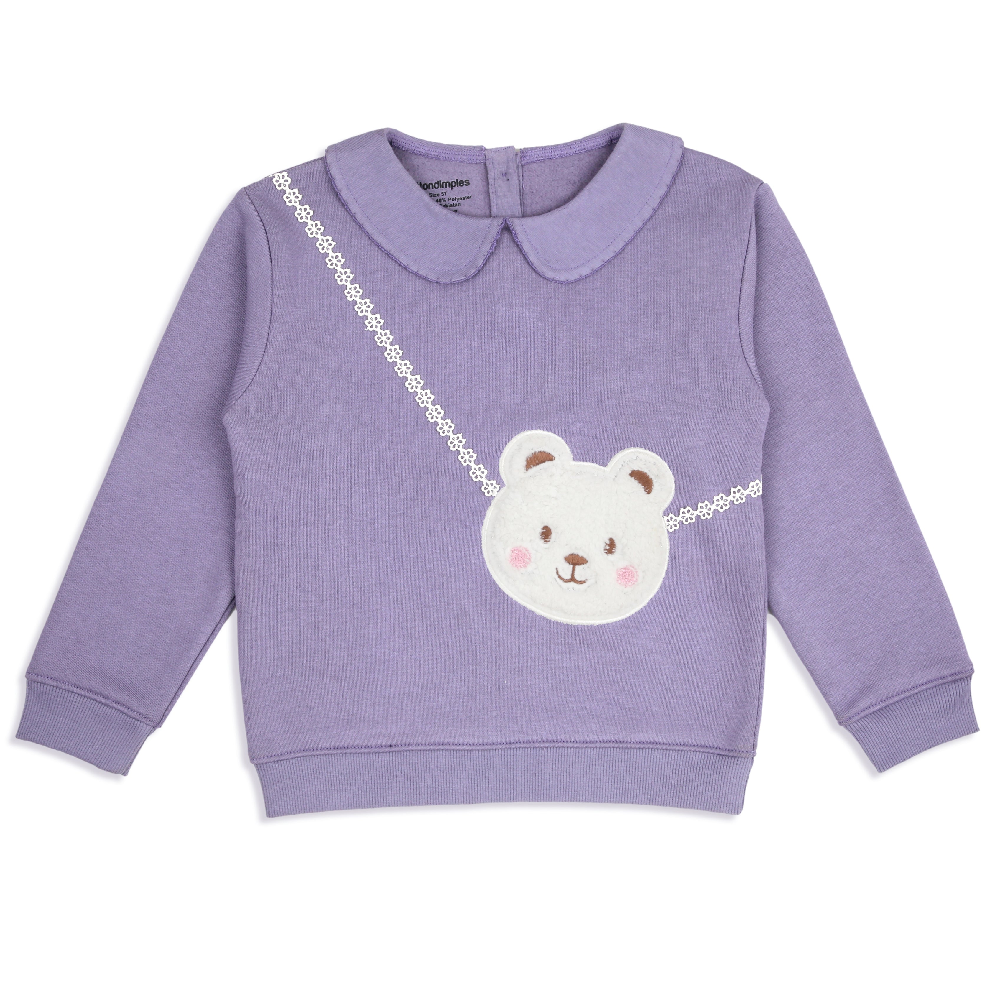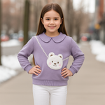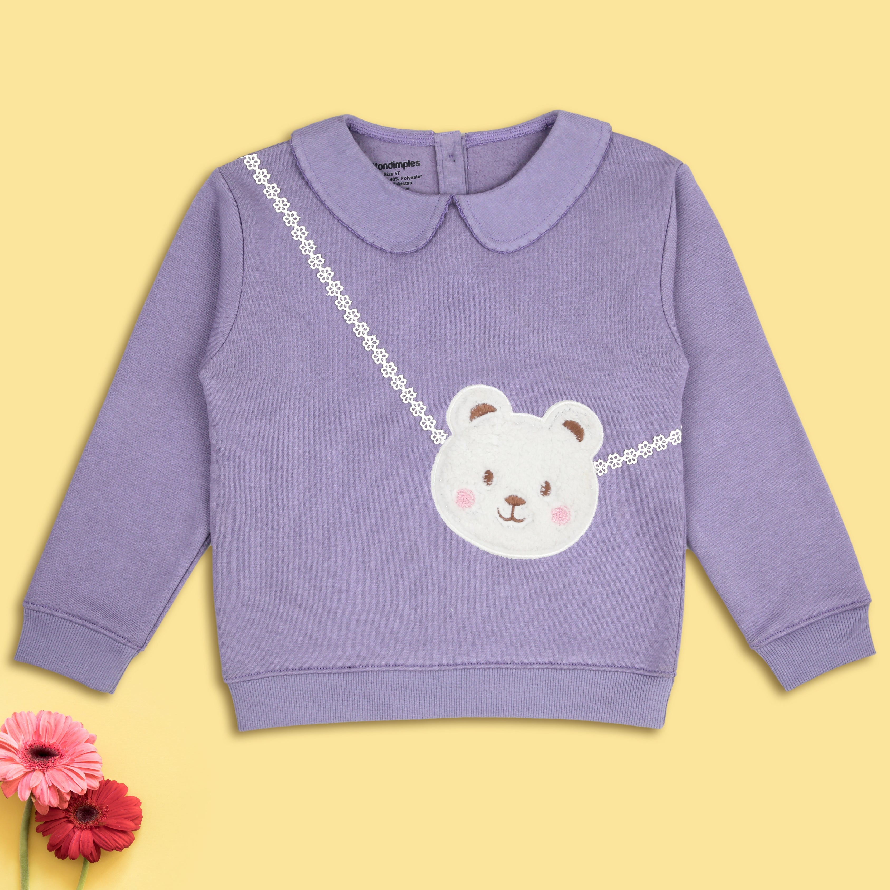Add a dose of cuteness and comfort to your little one’s winter wardrobe with this soft lavender fleece sweatshirt. Featuring a unique sherpa bear face applique designed to look like a sling bag—complete with delicate white lace strap detailing—this piece blends playful charm with cozy functionality. The rounded Peter Pan collar adds a sweet touch, making it perfect for casual outings or chilly evenings.