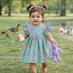 Step into spring with this enchanting floral frock! Crafted from a lightweight poly-blended fabric, this dress is as breezy as a summer day and perfect for playdates or casual outings. The pastel print bursts with wildflowers in pinks, purples, and greens, while flutter sleeves with ric-rac lace trim add a sweet, vintage charm. The front is adorned with a delicate satin bow, and the back features easy button closure for fuss-free changes. A twirl-worthy favorite in any little girl’s wardrobe!