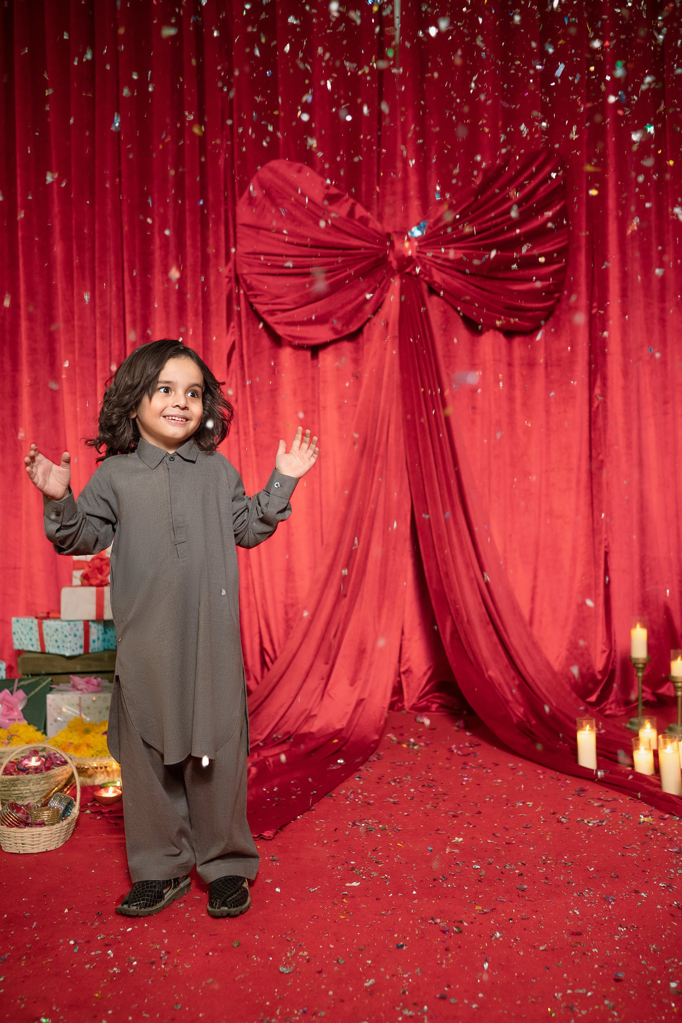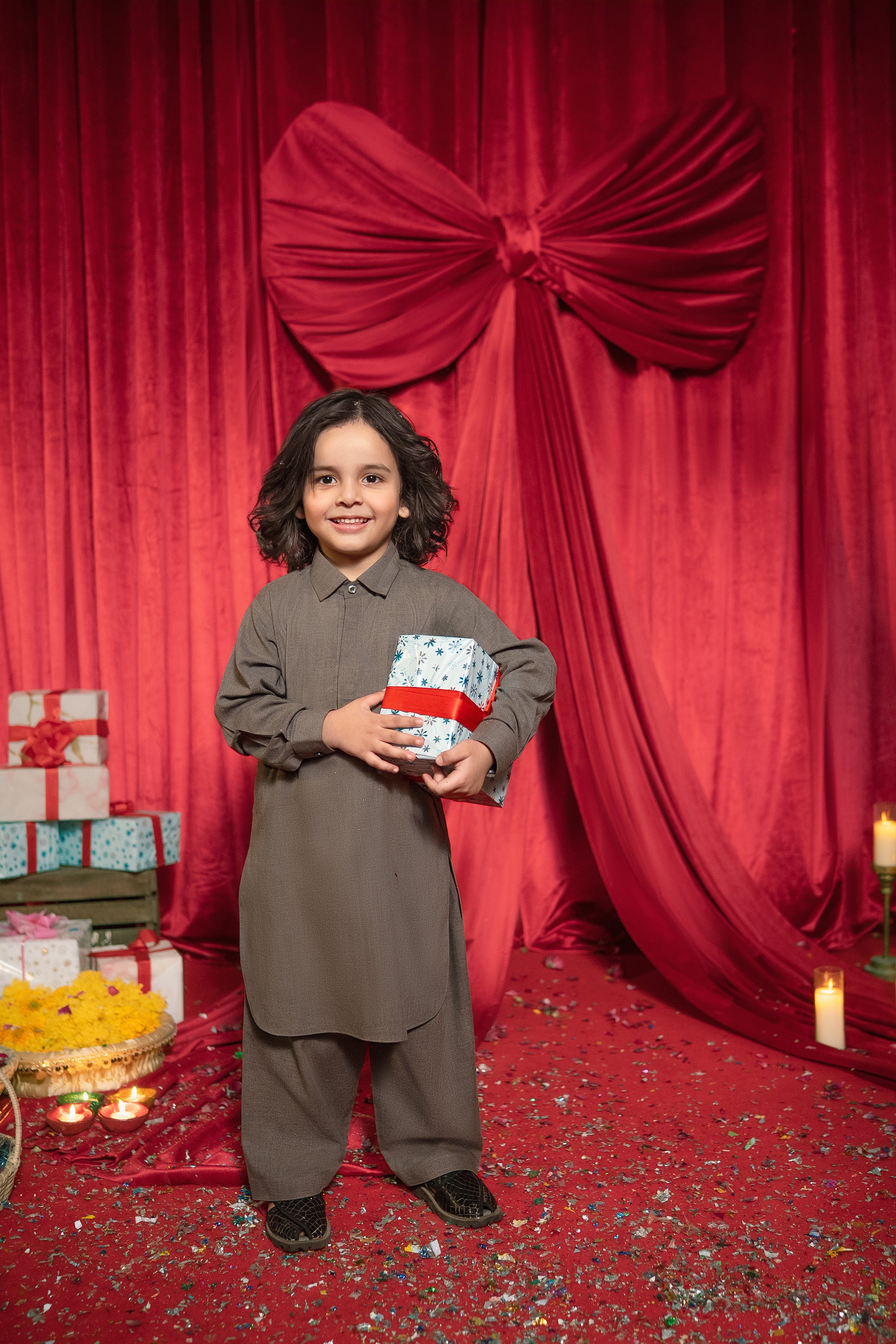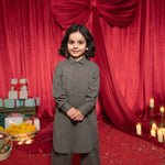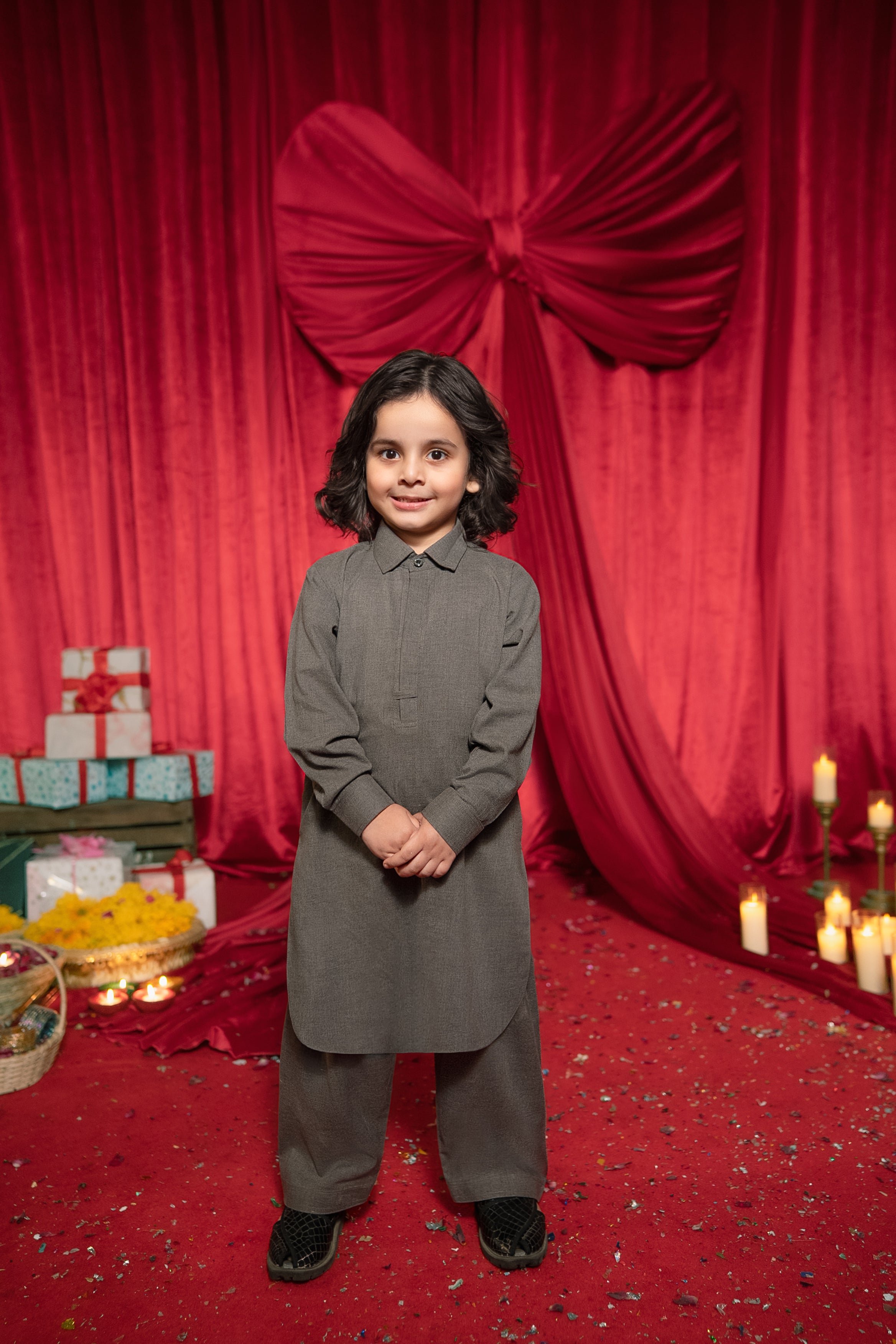 Midnight Ash is designed for young boys who carry confidence in clean silhouettes. Crafted in a sophisticated charcoal-grey tone, this 2-piece kurta shalwar set blends tradition with modern minimalism.